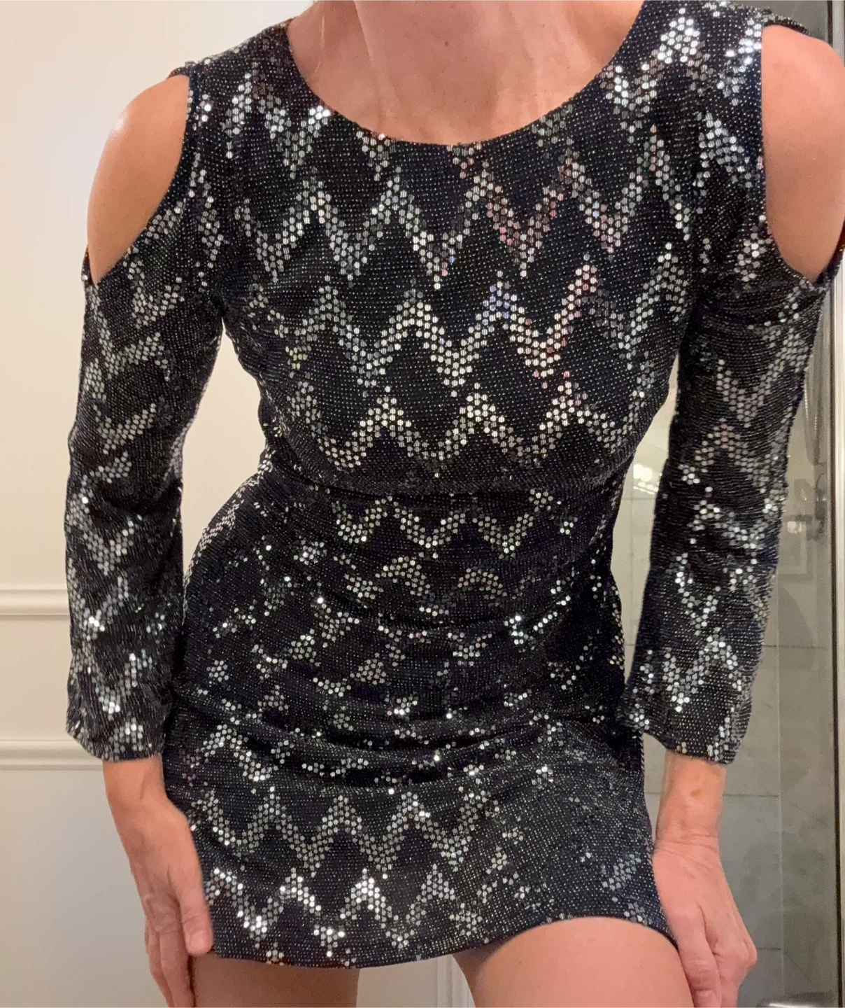 15Luxurious dress for the holidays. Fully lined. This is a really fun sparkly black dress! It has cutout shoulders and a cool zigzag pattern. Perfect for a night out or a special occasion!