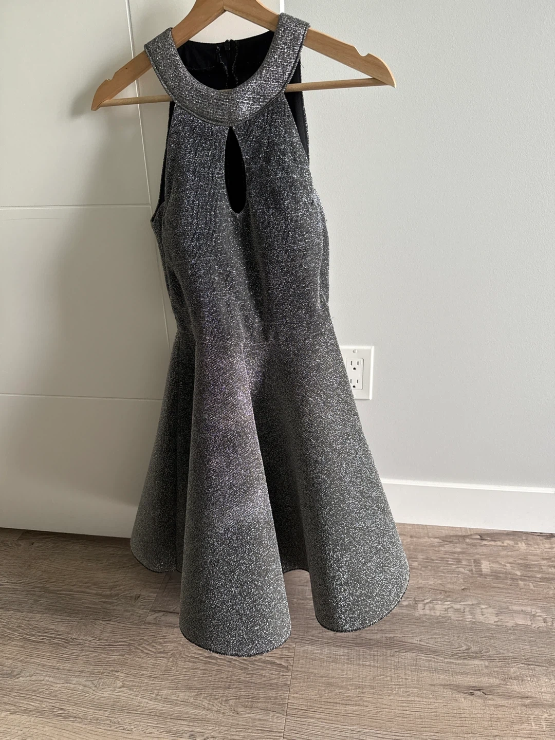 Selling a cute sparkly silver dress! It's perfect for a party or special occasion. The dress has a flattering fit and flare shape. It's in great condition and ready for a new home
