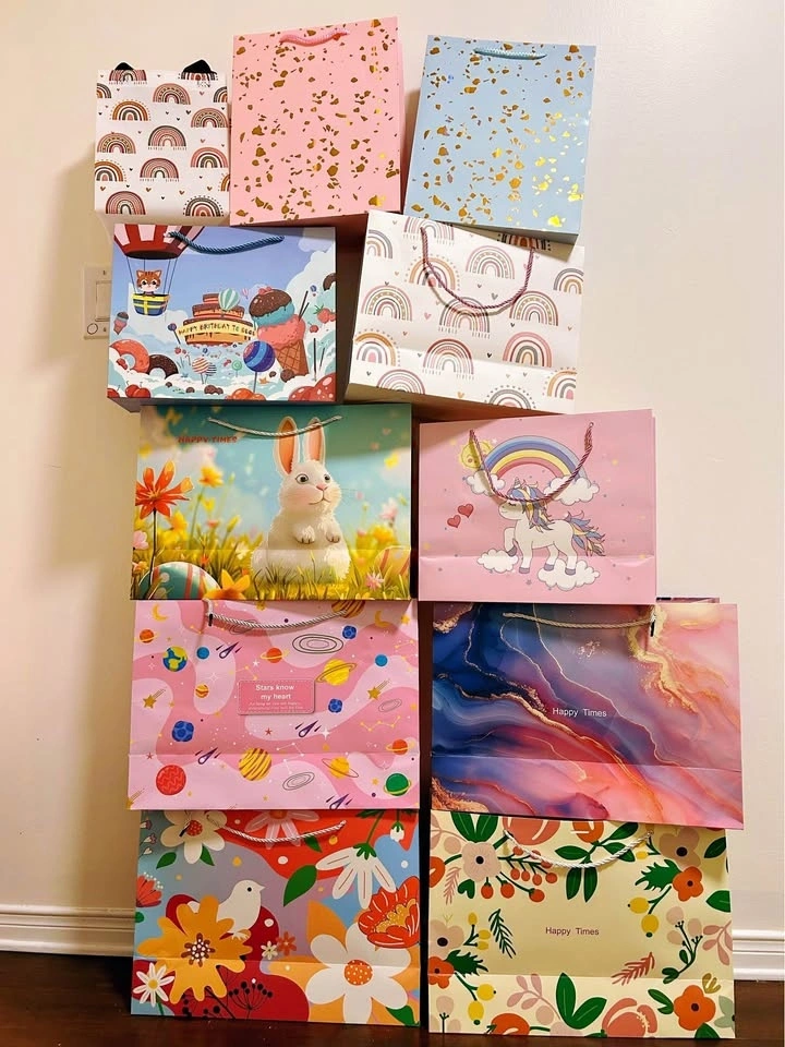 Gift bags, great for birthday parties, baby showers, small events, or gift wrapping. Material is strong paper; the smallest size is non-woven fabric.