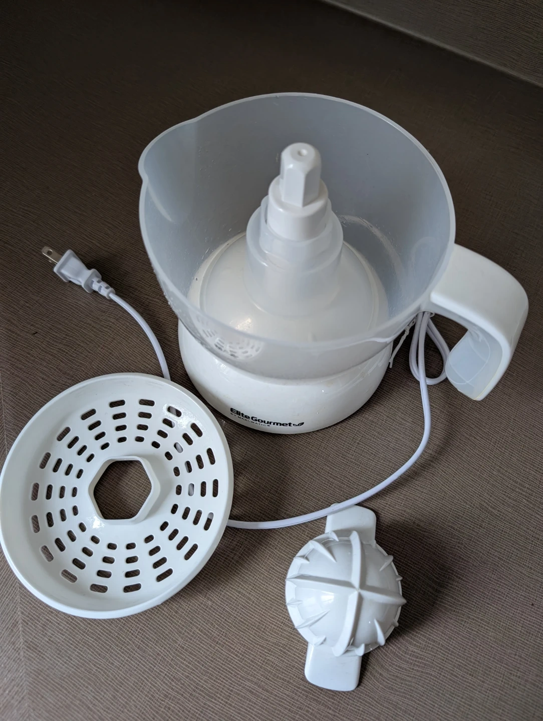 White electric citrus juicer by Elite Gourmet. It's got a detachable pitcher and comes with a reamer and strainer. Max fill line is visible on the pitcher.