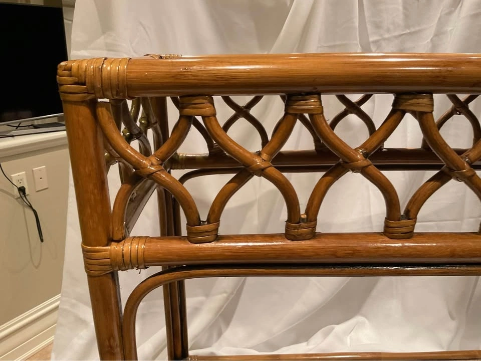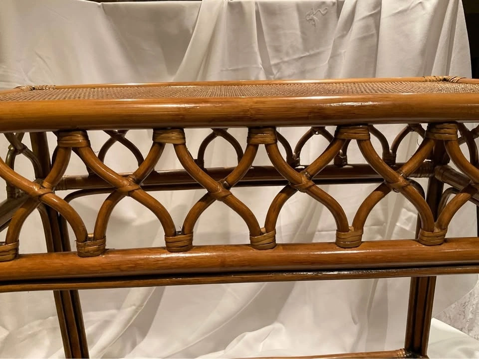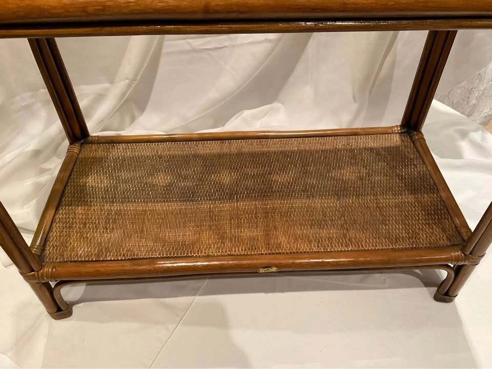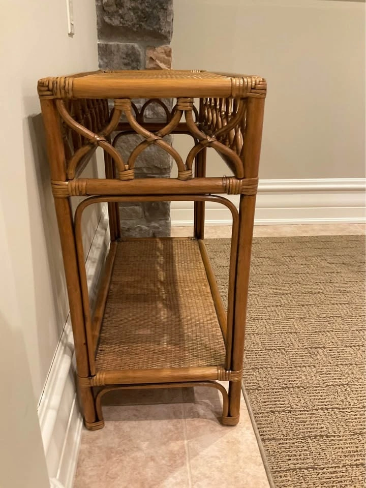 Stunning woven details in bamboo & cane. Solid, heavy piece with handwoven top and bottom shelf. Excellent quality craftsmanship in pristine condition. Height 29", Width 30". From a smoke & pet-free home. Located in Richmond Hill near Bathurst & King Rd. Cash only.