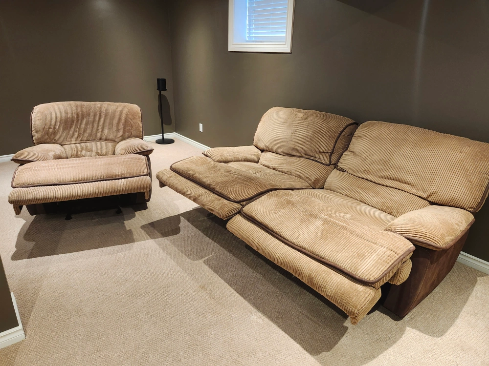 Comfy reclining sofa set for sale! Includes a sofa and a matching chair. The sofa and chair both recline, making them perfect for relaxing in your living room or basement. They are in good condition and ready for a new home. Smoke free and pet free house.