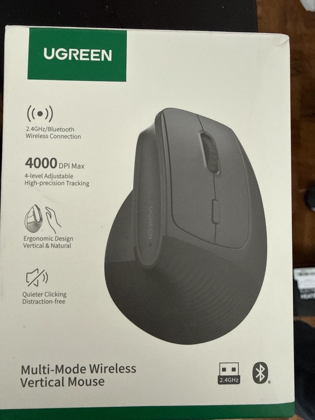 This is a UGREEN multi-mode wireless vertical mouse. It has 2.4GHz/Bluetooth wireless connection and 4000 DPI max with 4-level adjustable high-precision tracking. Features an ergonomic design for vertical & natural use and quieter clicking for distraction-free operation.