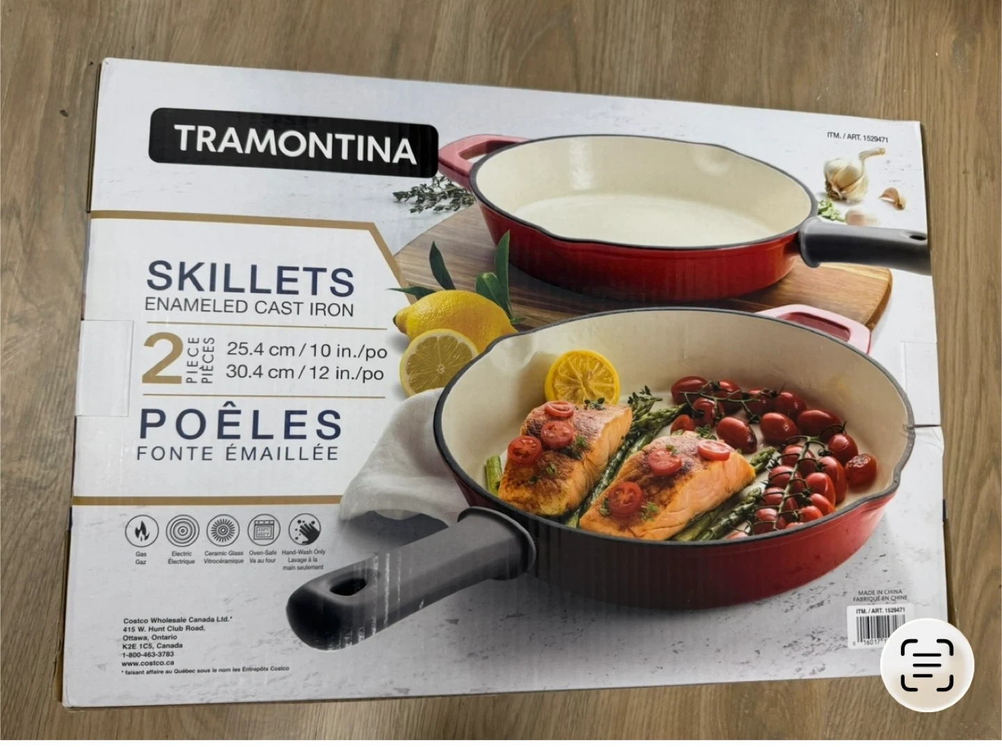 This is a set of two Tramontina enameled cast iron skillets. One skillet measures 25.4 cm (10 in.) and the other measures 30.4 cm (12 in.). They are oven-safe and compatible with gas, electric, and ceramic glass stovetops. Hand-wash only is recommended.