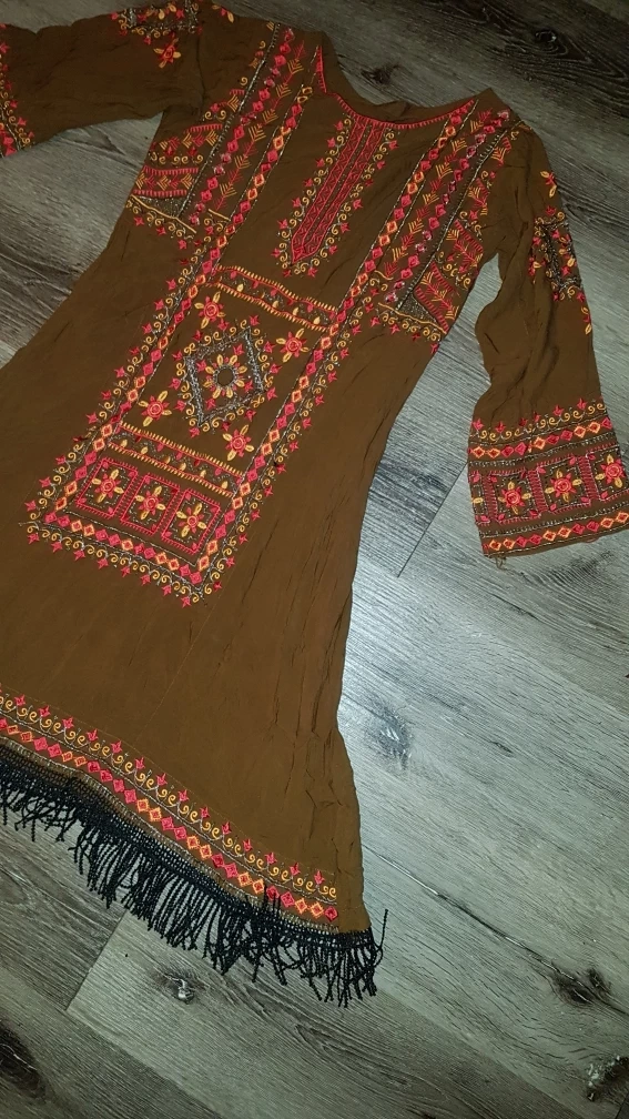 Here's a lovely brown dress with beautiful embroidery detailing! It has a unique design and would be a great addition to your wardrobe. The dress features long sleeves and a fringe at the bottom.only 2 time Worn it