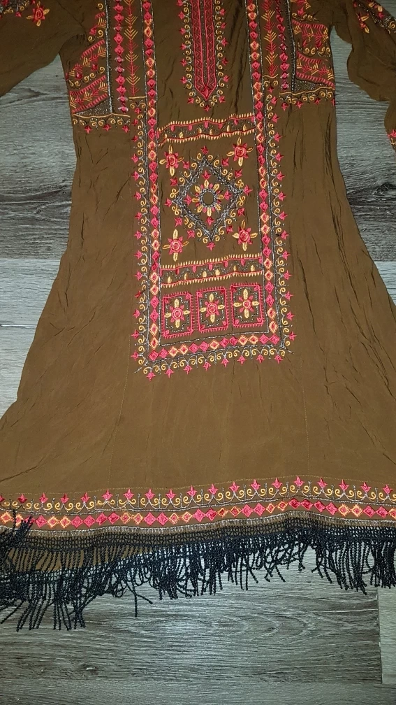 Here's a lovely brown dress with beautiful embroidery detailing! It has a unique design and would be a great addition to your wardrobe. The dress features long sleeves and a fringe at the bottom.only 2 time Worn it