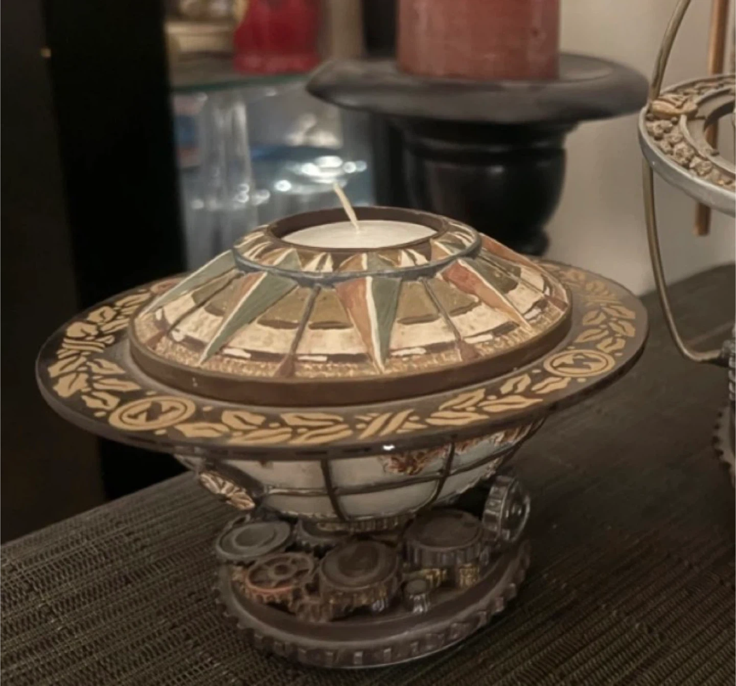Selling a charming candle holder of steampunk-style! This includes a candle holder, featuring intricate gear details and a unique, rustic aesthetic. Perfect for adding a touch of vintage-industrial flair to any room!