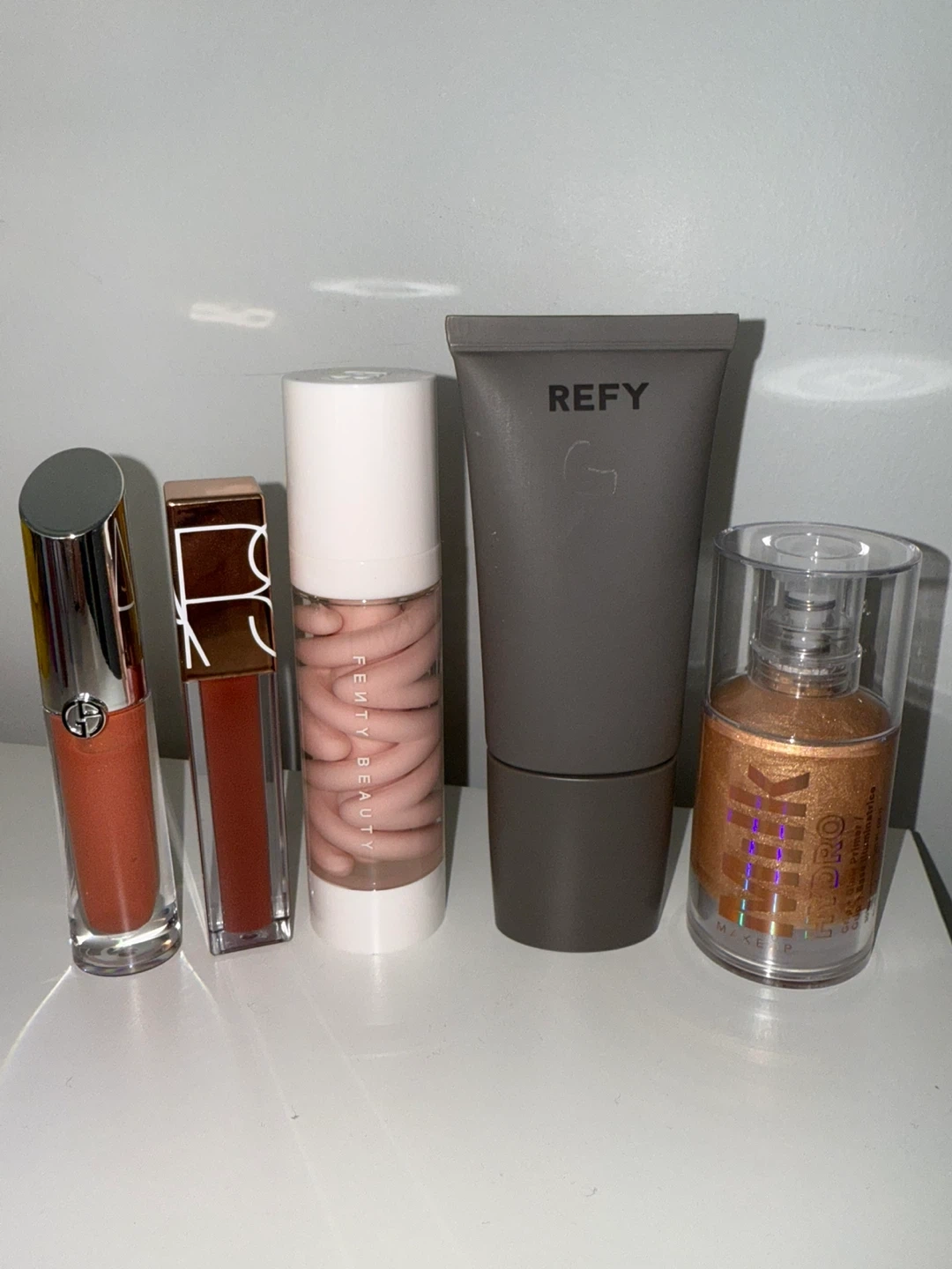 A collection of makeup products including a Giorgio Armani lip gloss, NARS lip gloss, Fenty Beauty Pro Filt'r primer, REFY cream contour, and Milk Makeup Hydro Grip primer. These items are perfect for a makeup artist or enthusiast looking to try out different brands. The set includes a variety of shades and finishes to create different looks.