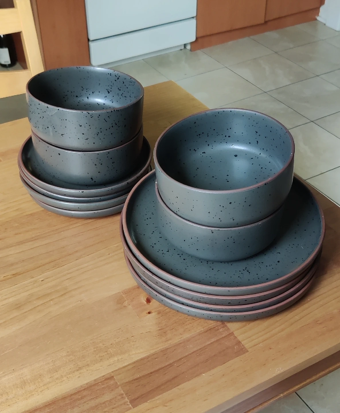 15Selling a set of speckled grey dinnerware. Includes 4 each of bowls, large and small plates. They're in great condition and ready for a new home