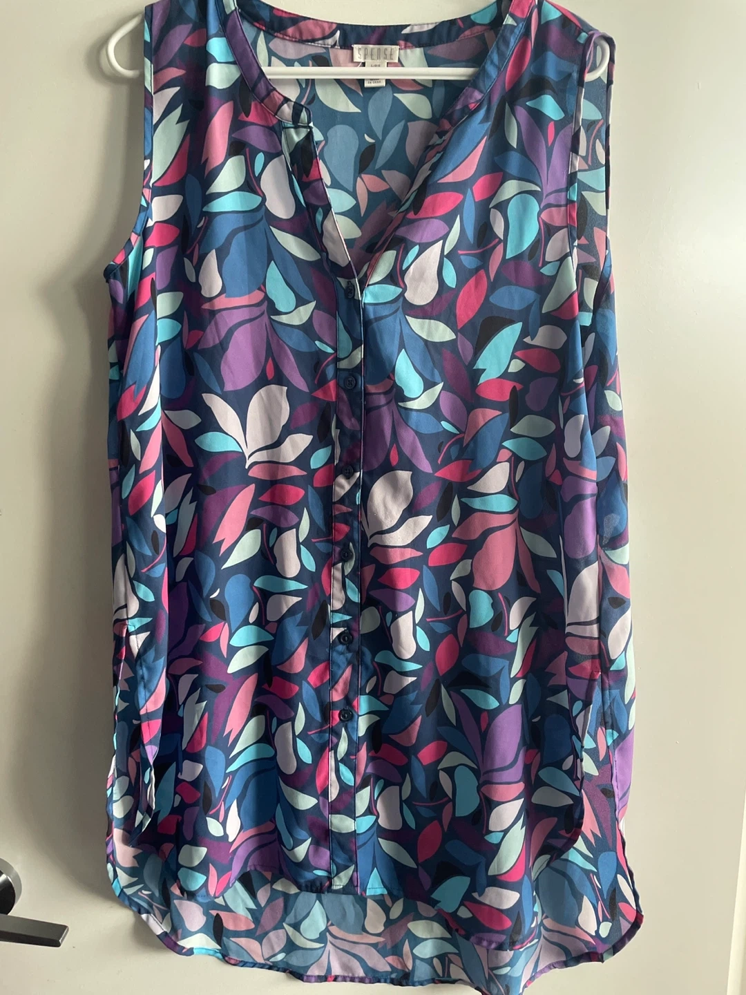 607Selling a lovely Spense sleeveless blouse in size L. It features a vibrant leaf pattern with shades of blue, purple, and pink. Perfect for a casual or dressed-up look!