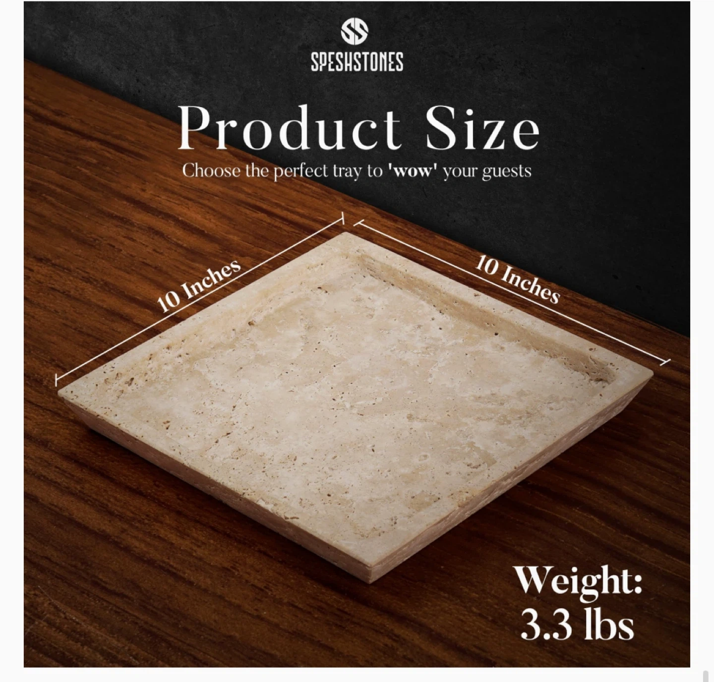 10This is a Speshstones travertine tray, perfect for serving or display! It's a square shape and measures 10 inches on each side. It weighs 3.3 lbs and is a cool way to serve in style!