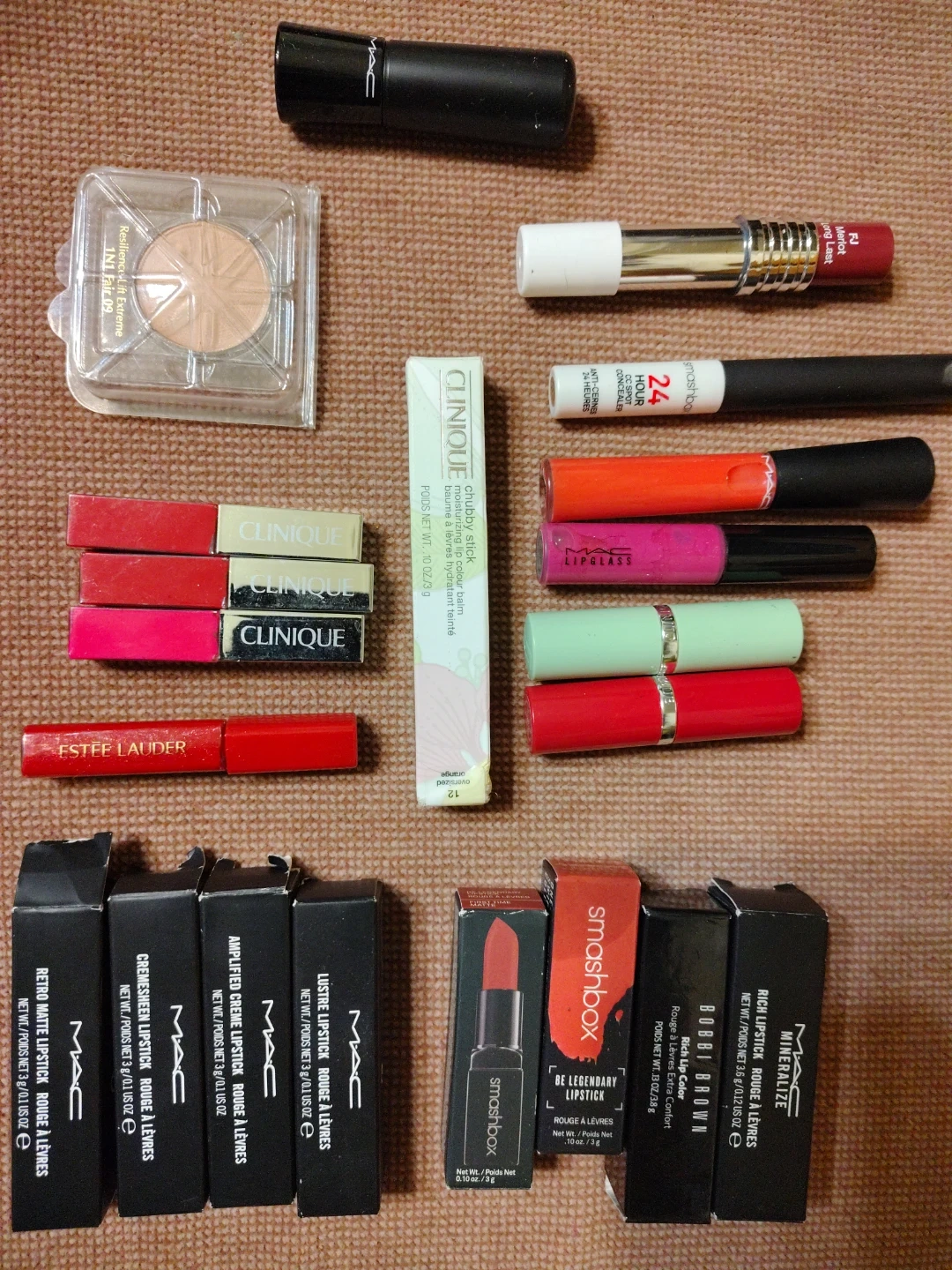 This is a lot of various lipsticks, lip gloss, and a concealer from brands like MAC, Clinique, Estee Lauder, Smashbox, and Bobbi Brown. It includes several MAC lipsticks in different finishes and colours, a Clinique Chubby Stick, a Smashbox lipstick, a Bobbi Brown lipstick, and an Estee Lauder lipstick. There's also a MAC lip gloss and a Smashbox 24 Hour CC Spot Concealer. Some items are new in box, others are used.