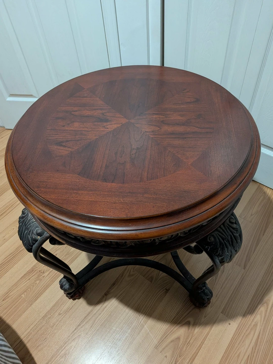 A classic round wooden side table with intricate details on the base and legs. This piece features a rich wood finish and a decorative carved apron. It's a sturdy and stylish accent for any room.