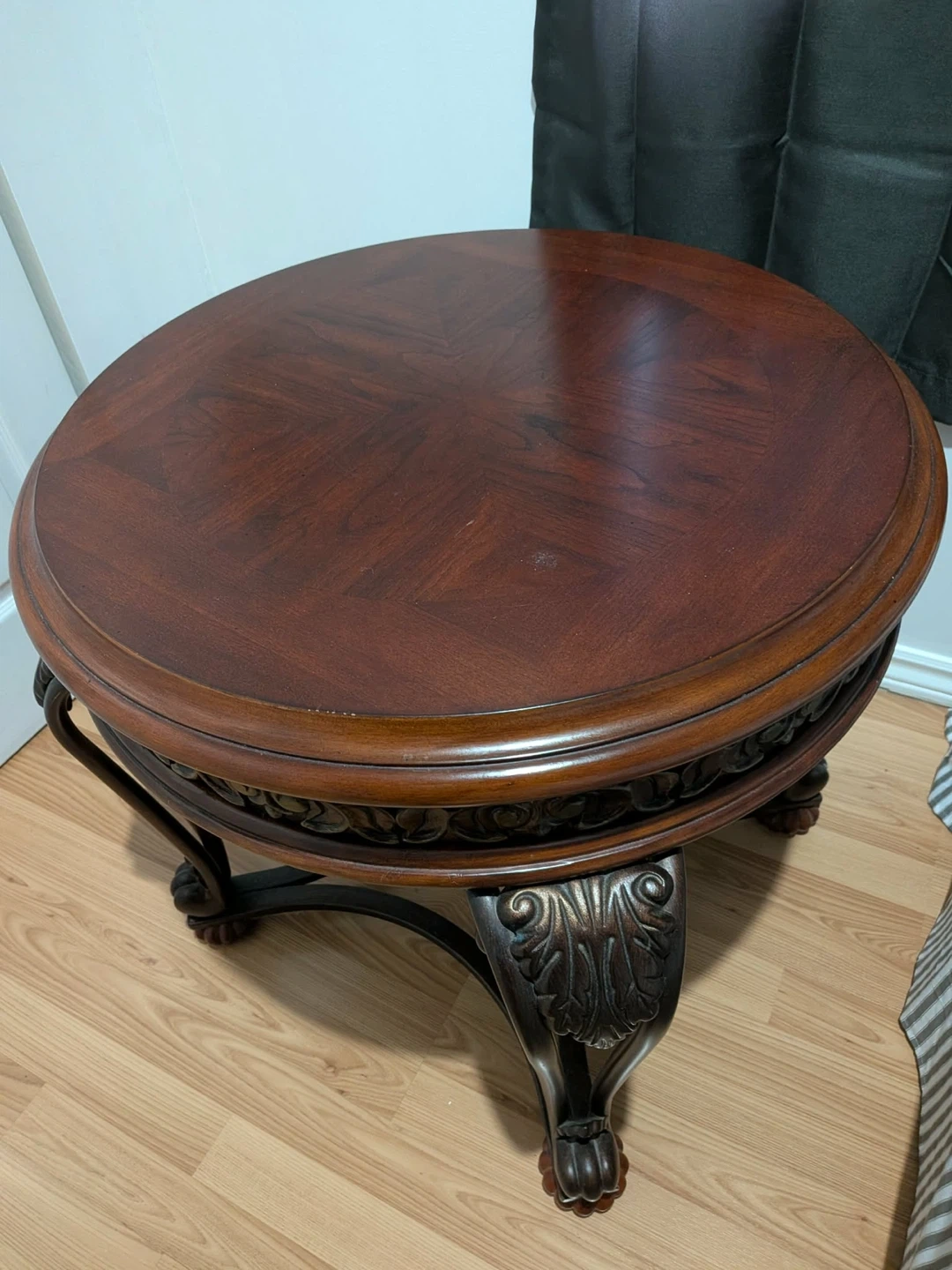 A classic round wooden side table with intricate details on the base and legs. This piece features a rich wood finish and a decorative carved apron. It's a sturdy and stylish accent for any room.