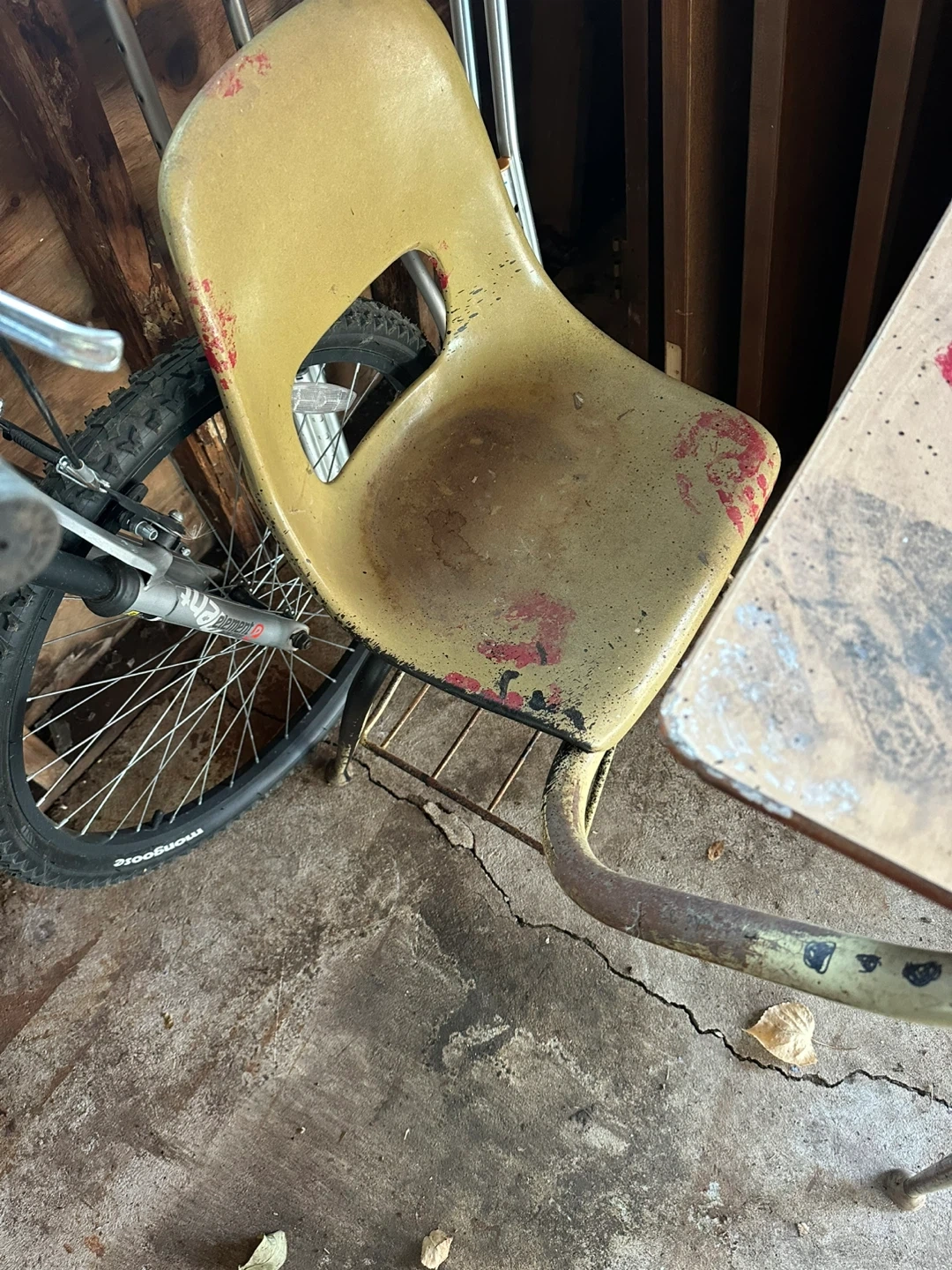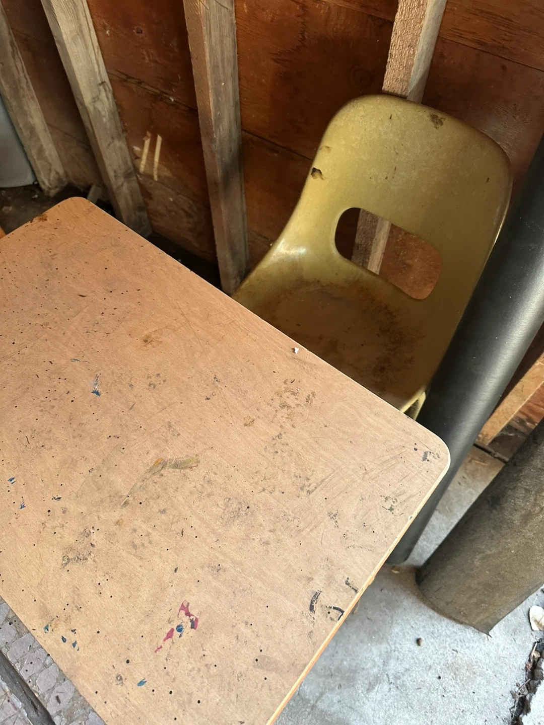 This is a vintage child's school desk and chair set. It features a wooden desktop with a metal frame and legs. The chair has a yellow plastic seat and back. It's seen some use, perfect for a craft project or upcycling!