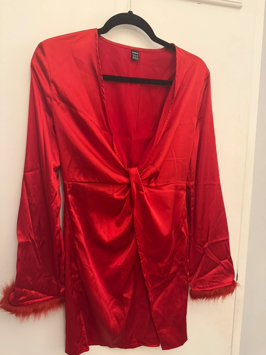 This SHEIN satin dress is a vibrant red colour. It features long sleeves with faux fur trim and a knotted front detail. It's a size M.