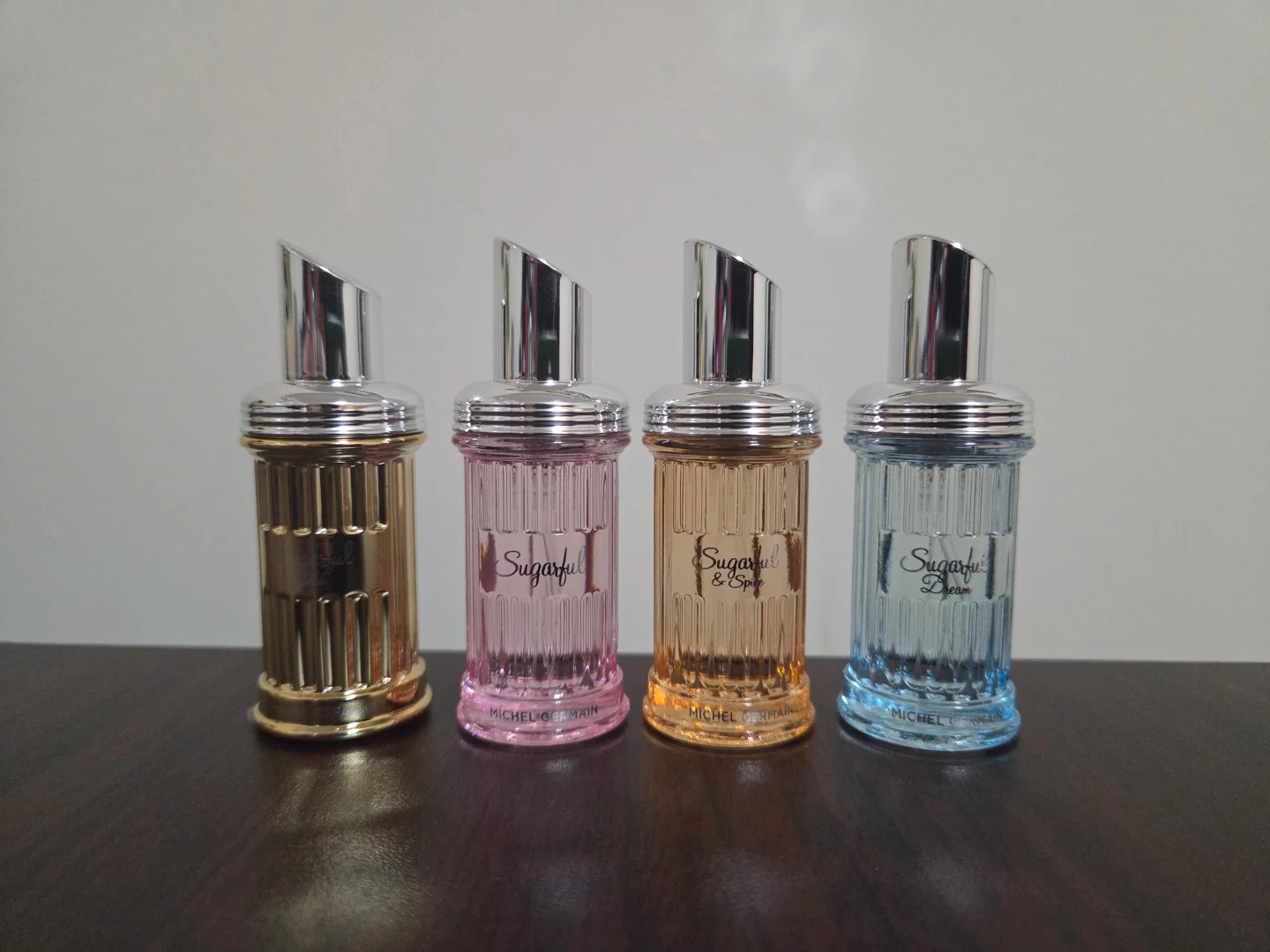Four assorted Michel Germain Sugarful fragrances. Includes Sugarful, Sugarful Gold, Sugarful & Spice, and Sugarful Dream. Glass bottles with silver caps. Each bottle contains 8mL.