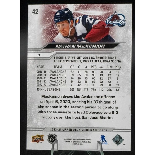2023-2024 Upper Deck Series 1 Nathan MacKinnon #42 card. Comes in a penny sleeve and top-loader. Feel free to message if you have any questions!