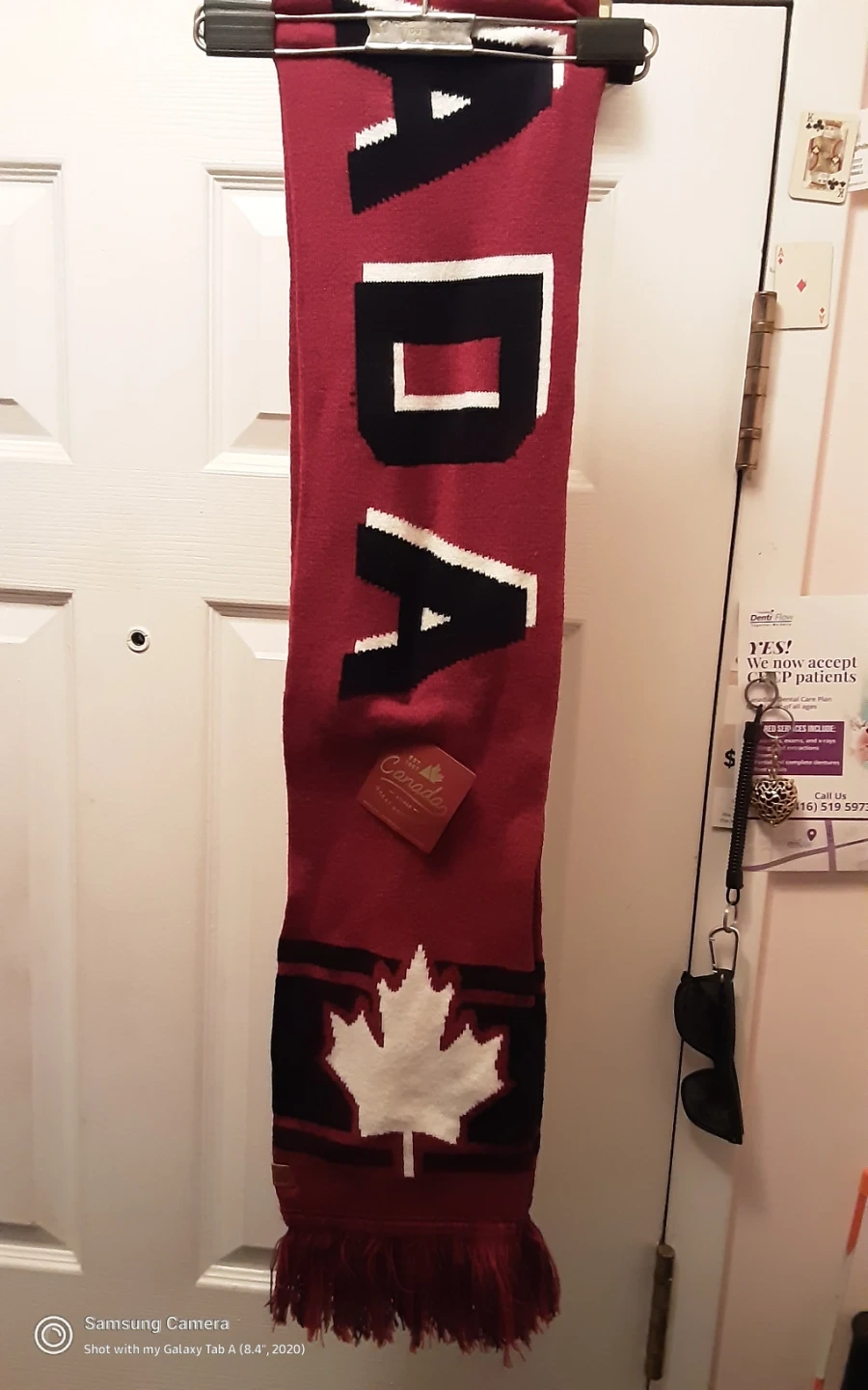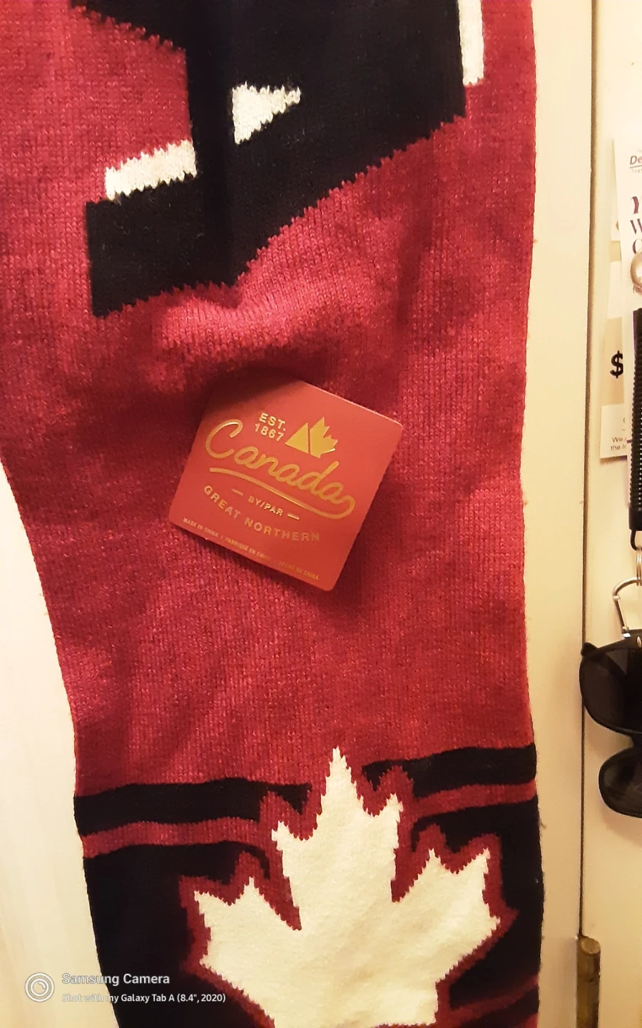 Cozy Canada Great Northern scarf in a lovely burgundy colour! It features the iconic maple leaf and "CANADA" lettering. Perfect for showing off your Canadian pride or staying warm during the colder months