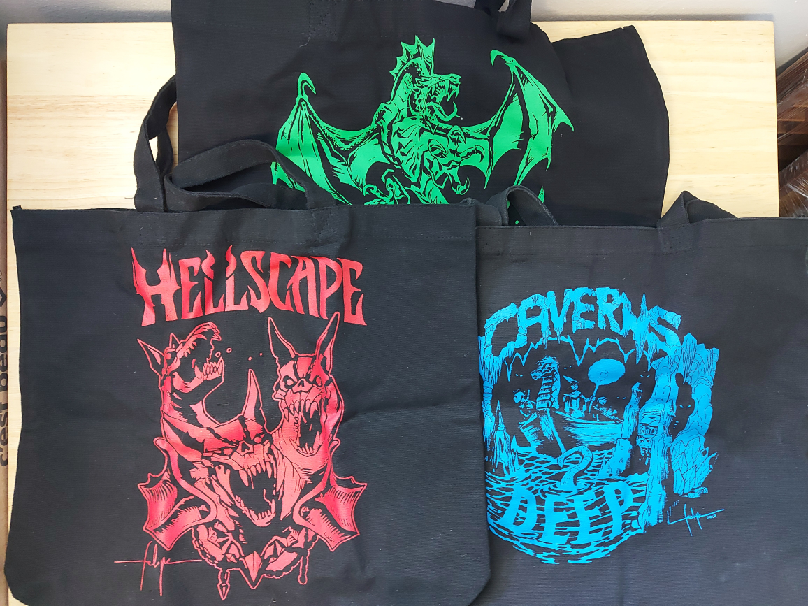 Brand new fantasy tote bags with iconic Dwarven Forge D&D images. Features the Hellscape, Wildlands, and Caverns Deep imagery.