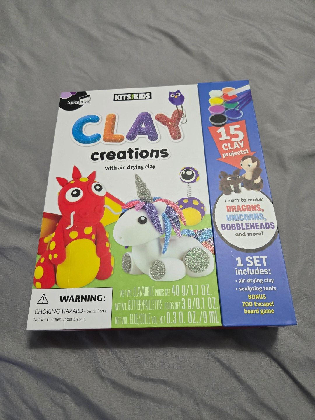 I'm selling a brand new Spice Box Kits for Kids Clay Creations set! It comes with air-drying clay, sculpting tools, and a bonus Zoo Escape! board game. Learn to make dragons, unicorns, bobbleheads, and more with the 15 clay projects included