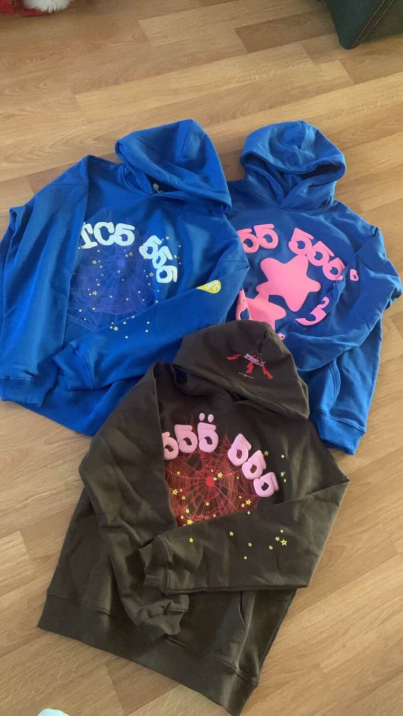 Selling three spider hoodies brand new condition. Two are blue and one is brown. They feature unique graphic designs.