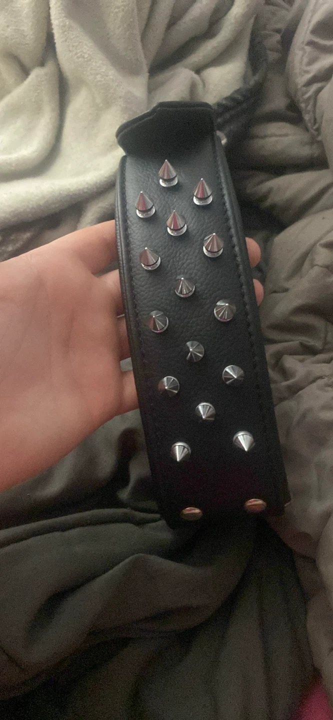 Selling a black leather collar with silver spikes. It features a buckle closure and a metal ring. Great for adding a bit of edge to your look
