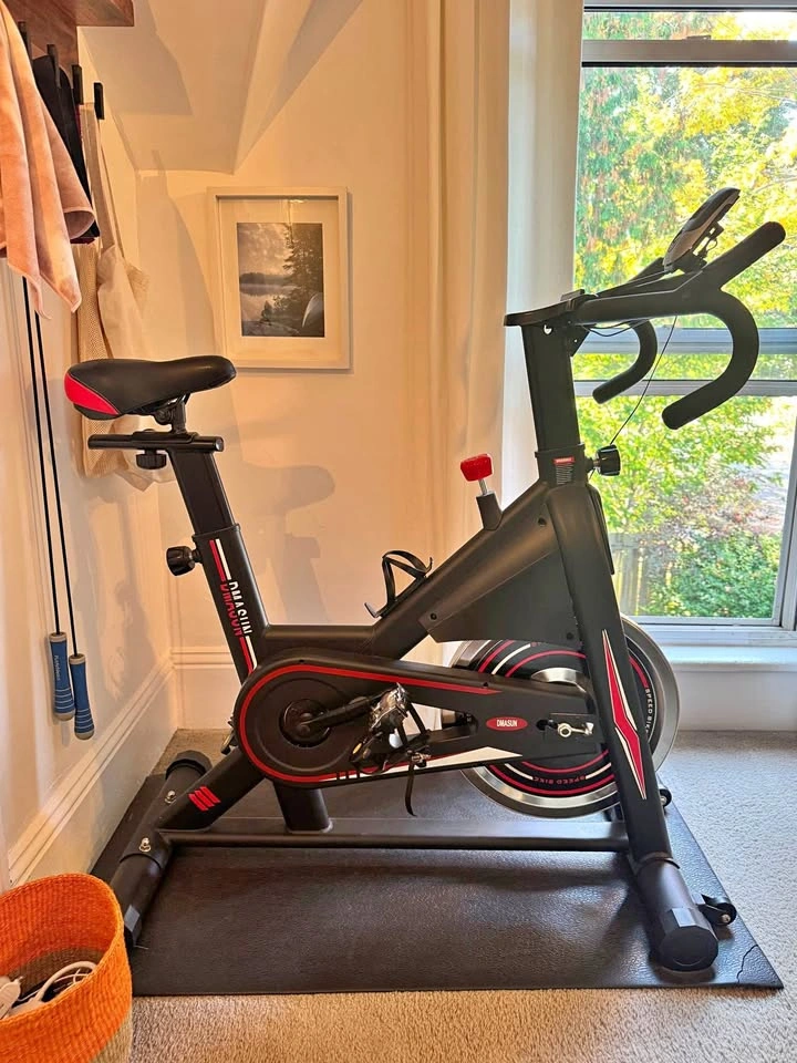 10Indoor spin bike with heavy duty mat for underneath. It also has a cadence sensor in it that connects to your phone or watch. Works well, quiet ride. Located in Port Perry.