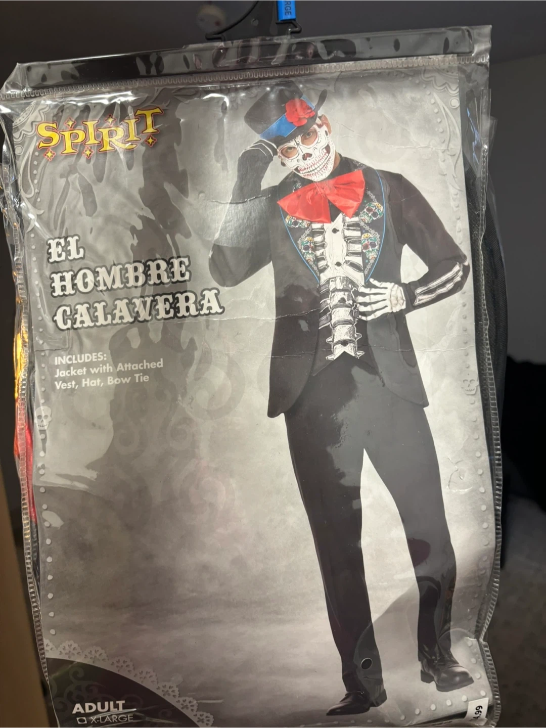 23Selling a Spirit El Hombre Calavera costume in adult extra-large size. The costume includes a jacket with attached vest, hat, and bow tie. Perfect for Halloween or costume parties!