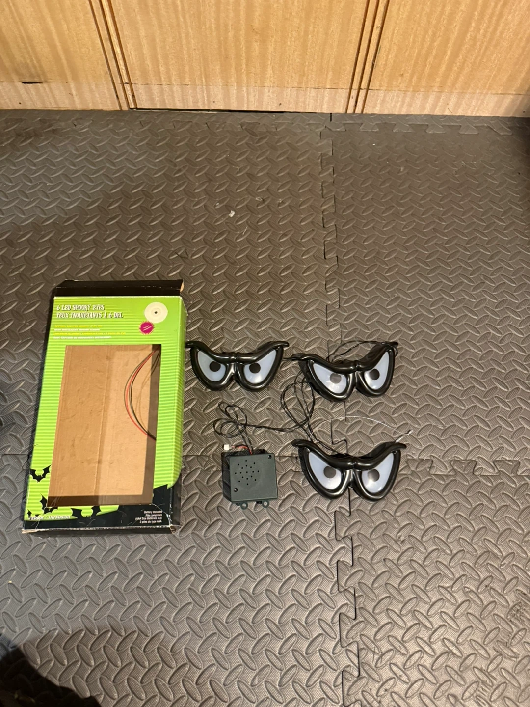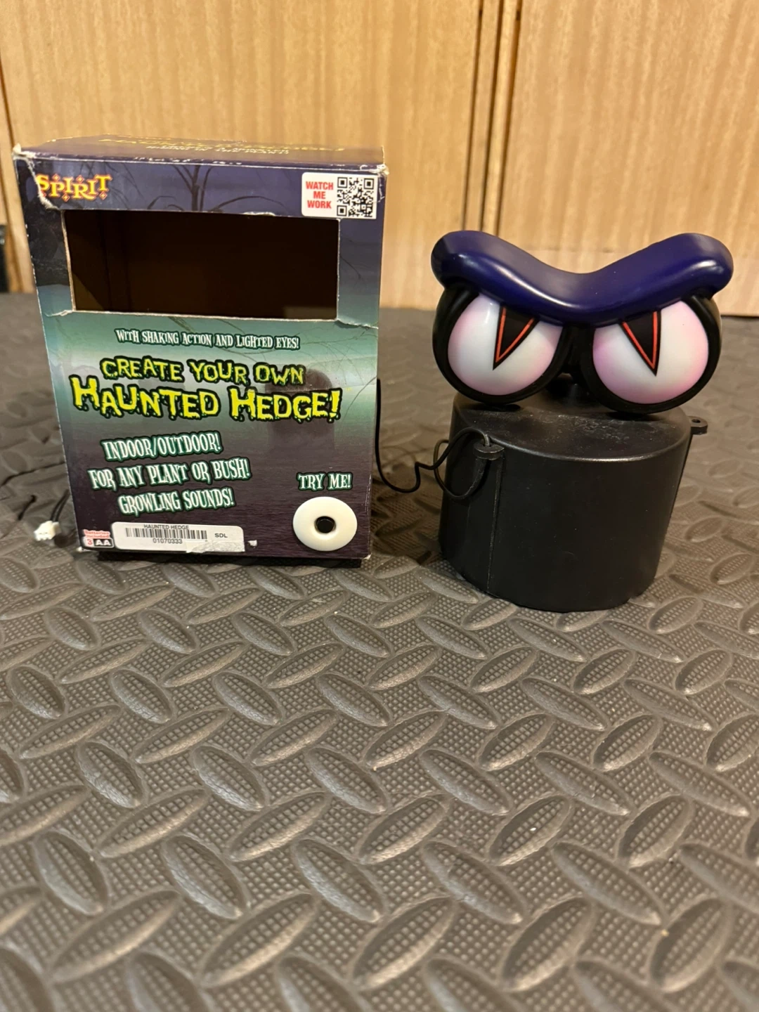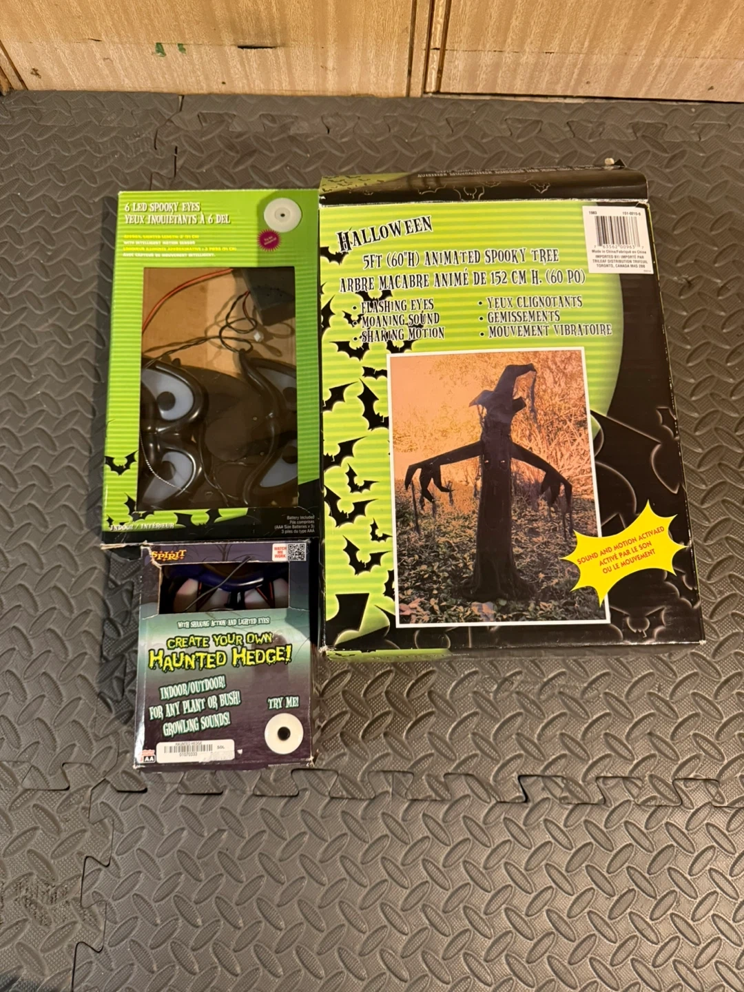 60Get ready for Halloween with these spooky decorations! I have a 5ft (60") animated spooky tree and a set of 4 LED spooky eyes and the Haunted Hedge. The tree features finishing eyes, a moaning sound, and shaking motion. The eyes have a shaking action and lighted eyes and the Haunted Hedge makes growling sounds. They are all working good except the spooky tree has one eye burnt out.
