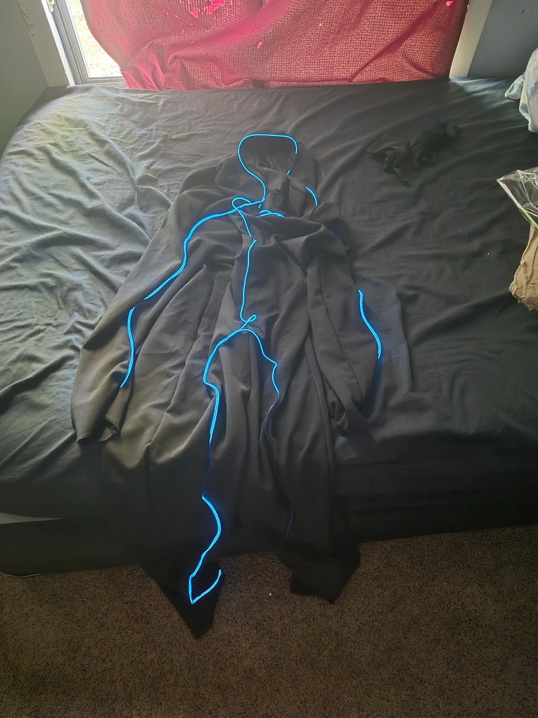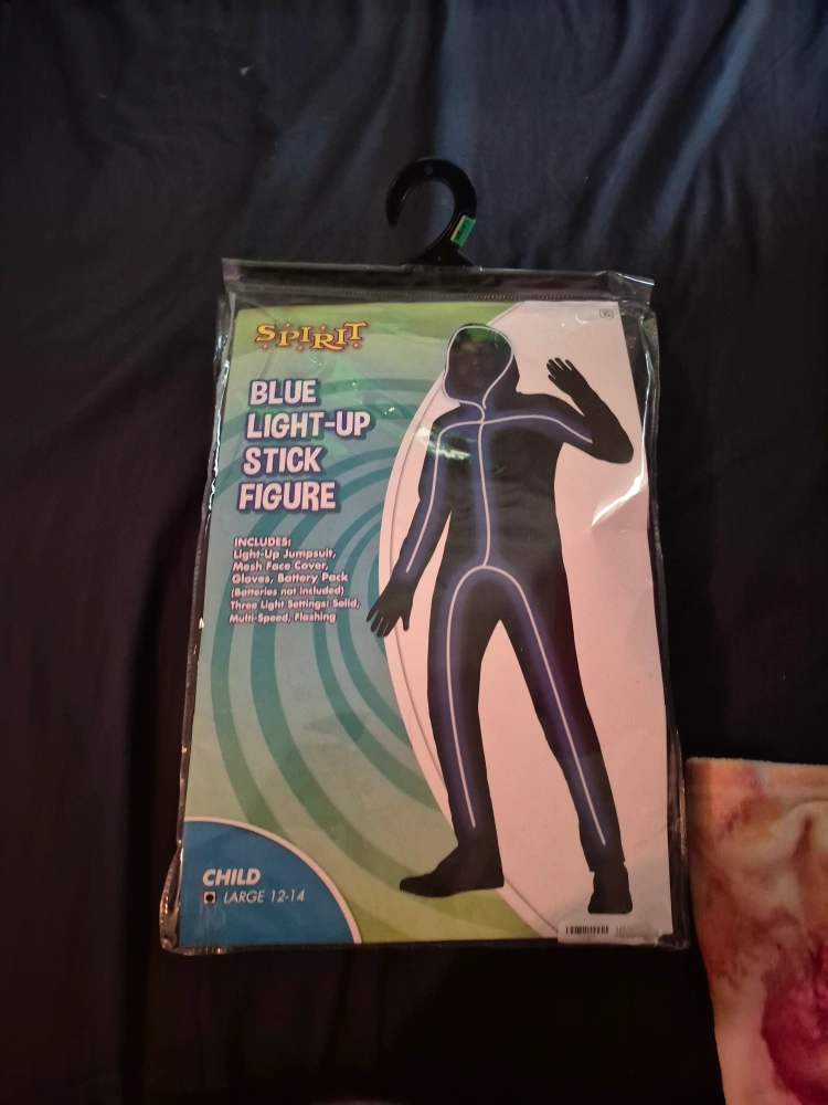 65Selling a Spirit Halloween Blue Light-Up Stick Figure costume, size large (child size 12-14). Includes the light-up jumpsuit, battery pack, and gloves. It has three light settings: solid, multi-speed flashing There is no mesh face cover Pickup and Cash Only