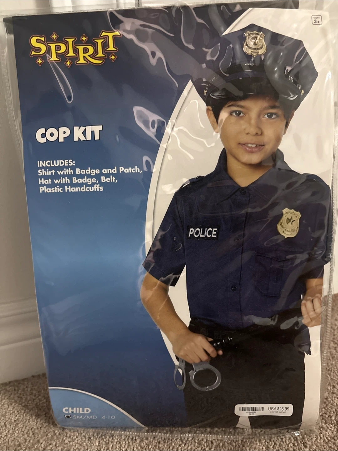 Selling a Spirit Halloween child's cop kit costume. It includes a shirt with a badge and patch, a hat with a badge, a belt, and plastic handcuffs. The size is child S/M(recommended for 4 to 10 year olds).