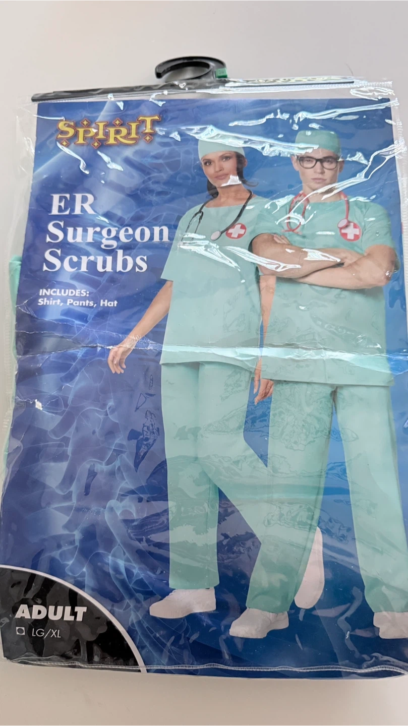 122Selling a set of Spirit Halloween ER Surgeon Scrubs in adult size L/G-XL! It includes a shirt, pants, and hat, perfect for a costume party or Halloween Selling for 20.00