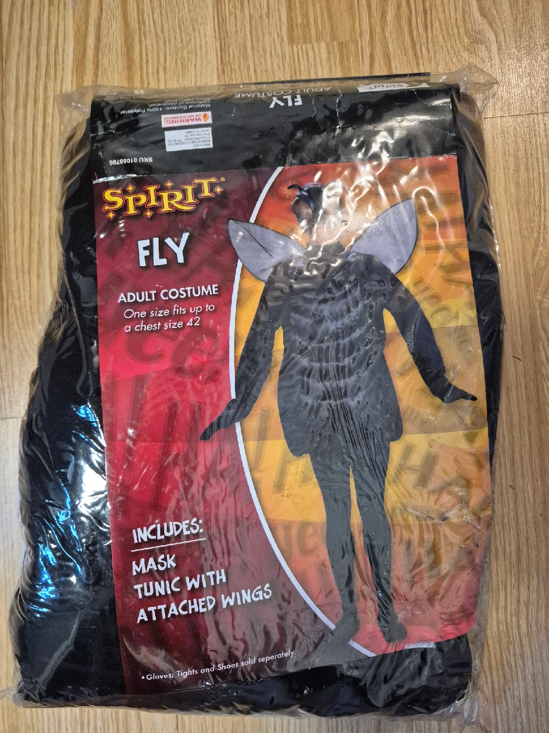 Selling a Spirit Halloween Fly adult costume, still in its original packaging! The costume is one size and fits up to a chest size 42. Includes the mask and tunic with attached wings. Gloves, tights and shoes are sold separately BRAND NEW ADULT HALLOWEEN COSTUME...FLY