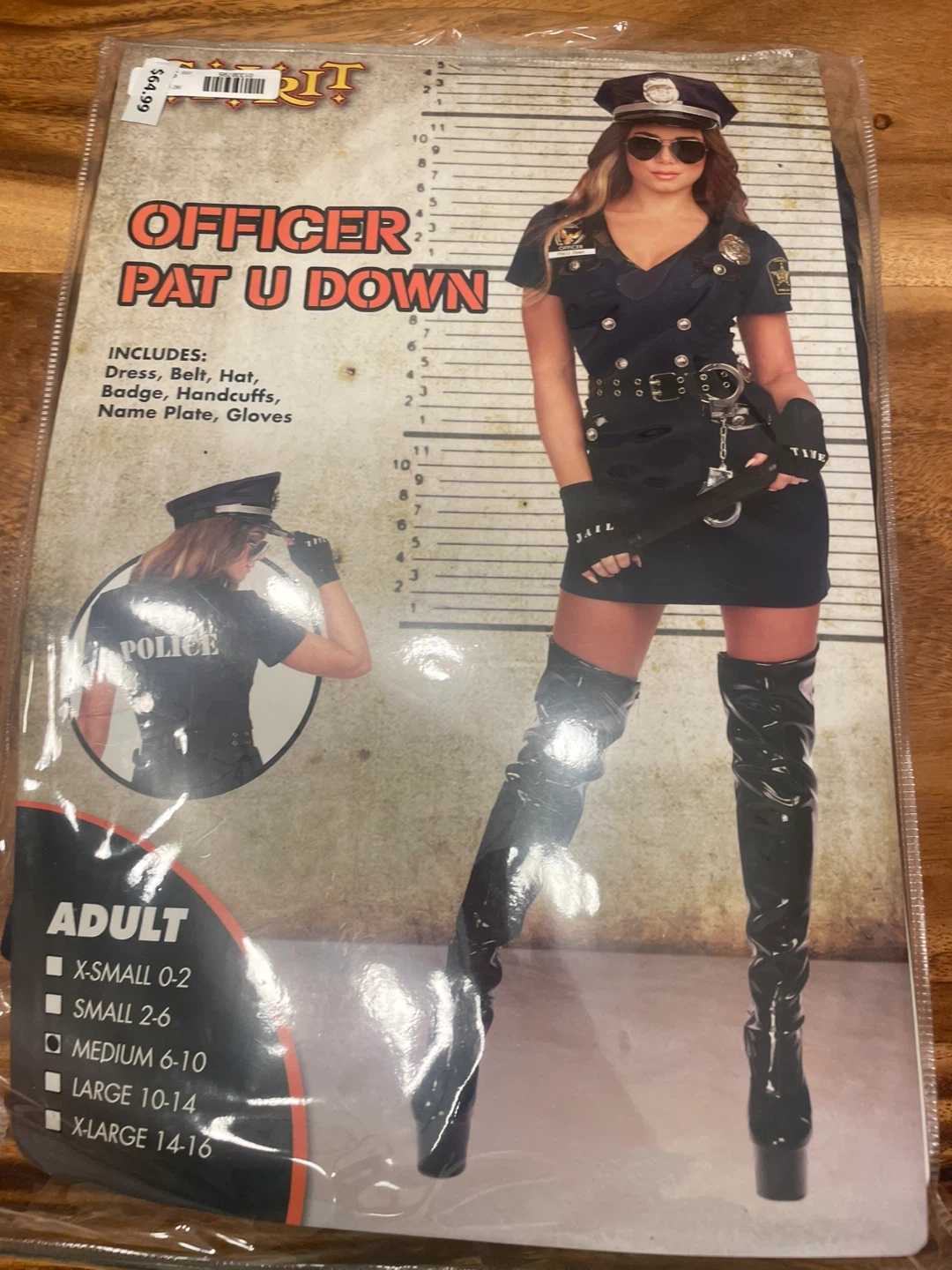 20Get ready for Halloween with this Officer Pat U Down costume from Spirit Halloween! This adult costume includes the dress, belt, hat, badge, handcuffs, and name plate. It's a size medium (6-10). Originally priced at $64.99.