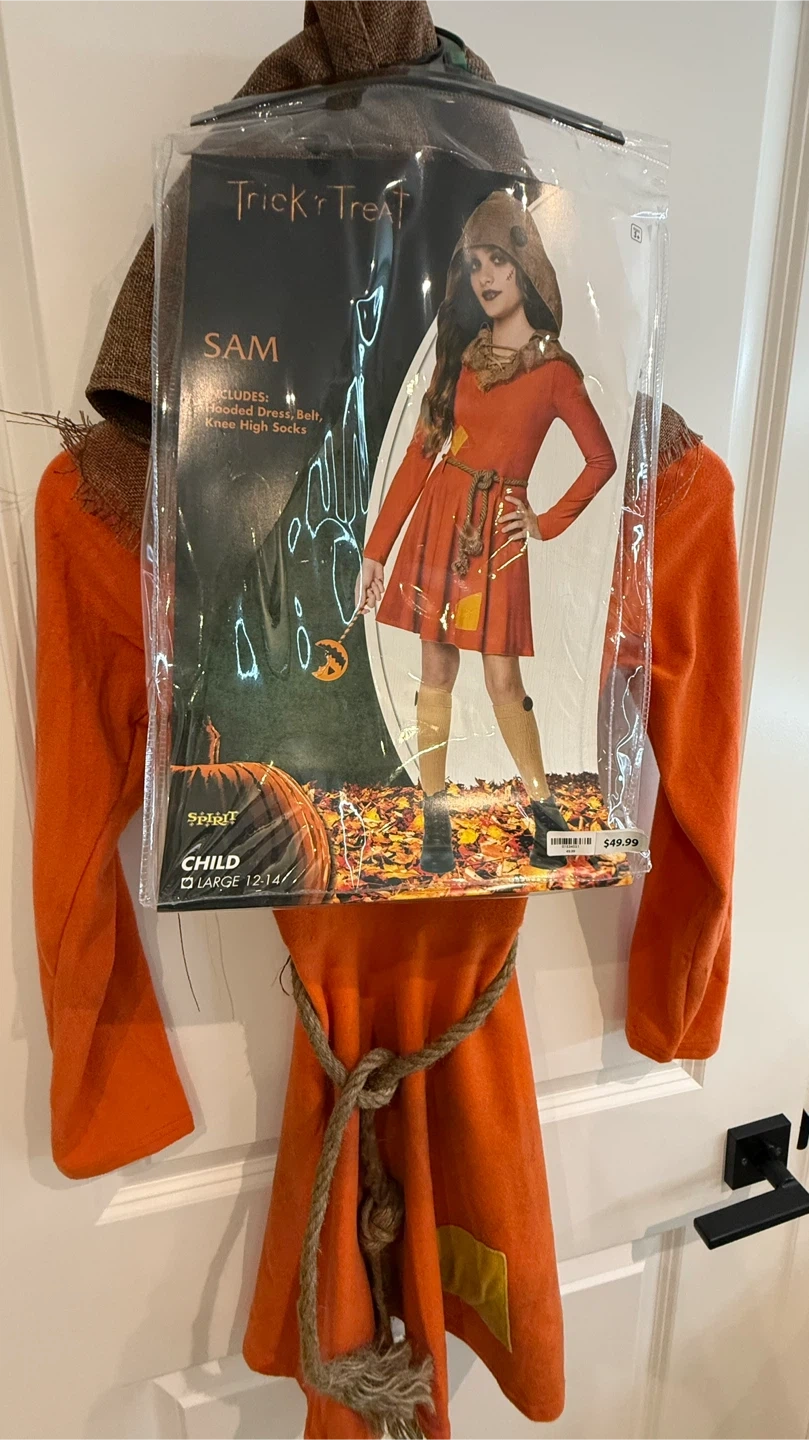 60Get ready for Halloween with this Spirit Halloween Trick 'r Treat Sam costume! It's a child's size large (12-14). The costume includes the hooded dress, belt, and knee-high socks. Originally priced at $49.99.