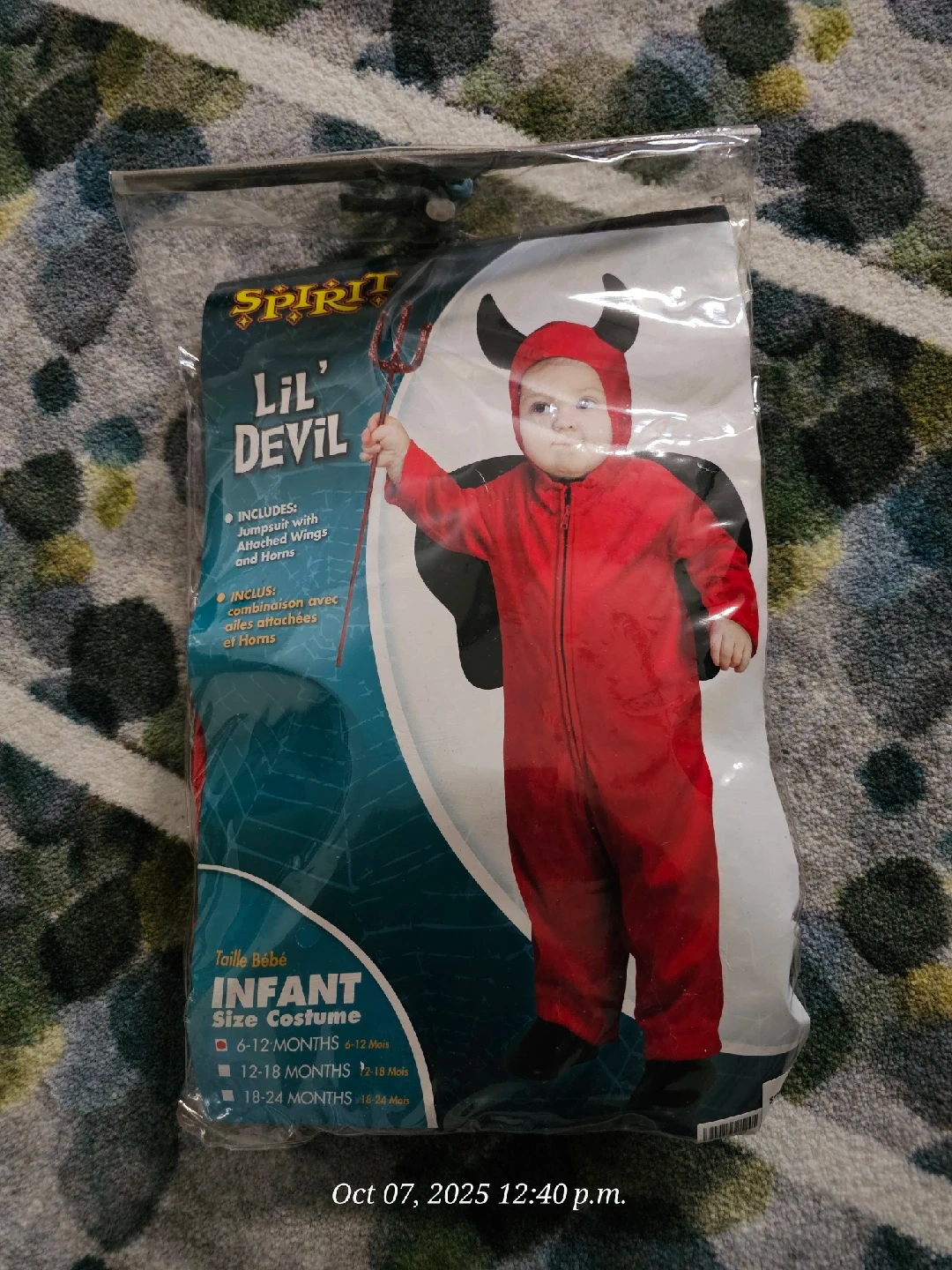 10Selling a gently used Spirit Lil' Devil infant costume! It's in great condition and perfect for Halloween or dress-up. This size is for 6-12 months. It includes the jumpsuit with attached wings and horns!