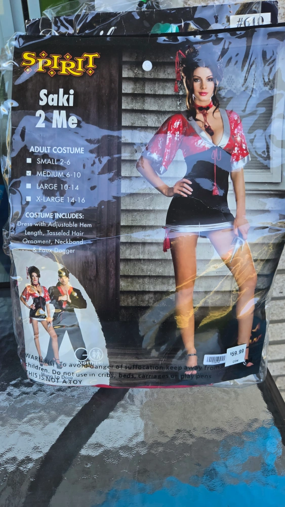 Selling a Spirit Saki 2 Me adult costume, size medium (6-10). The costume includes a dress with an adjustable hem length, a tasseled hair ornament, a necklace, and a toy dagger. Perfect for Halloween or costume parties!