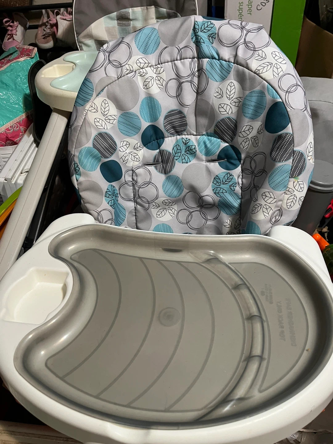 This is a padded seat cushion designed for an infant high chair. It features a circular and leaf pattern in blue, grey, and white. The seat comes with a grey plastic tray with raised edges and a cup holder.