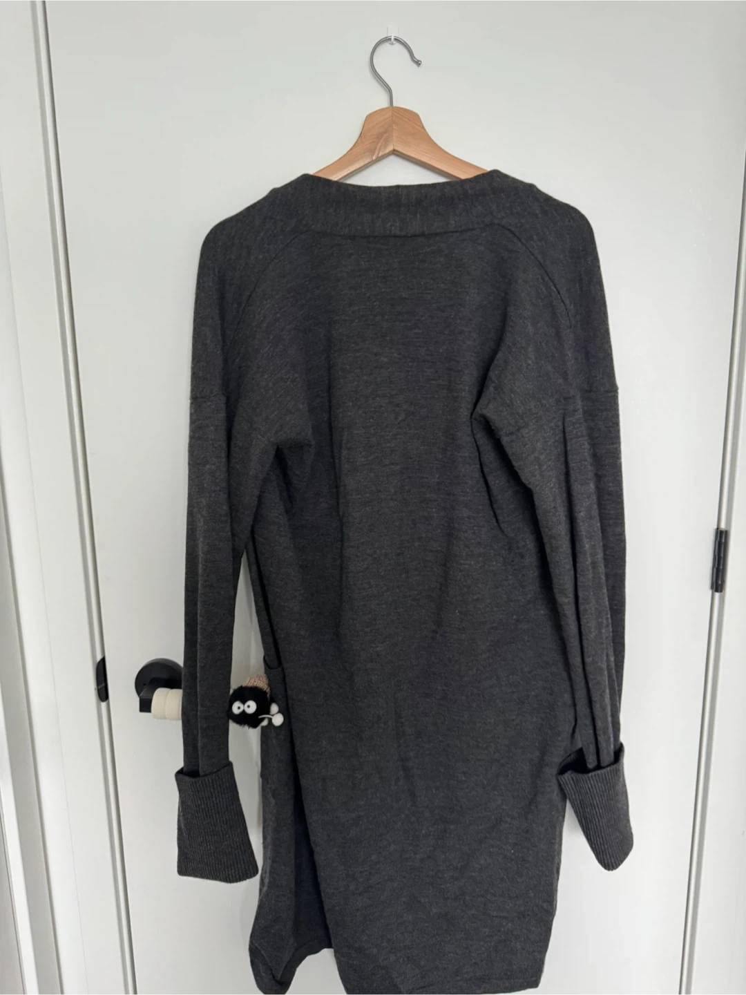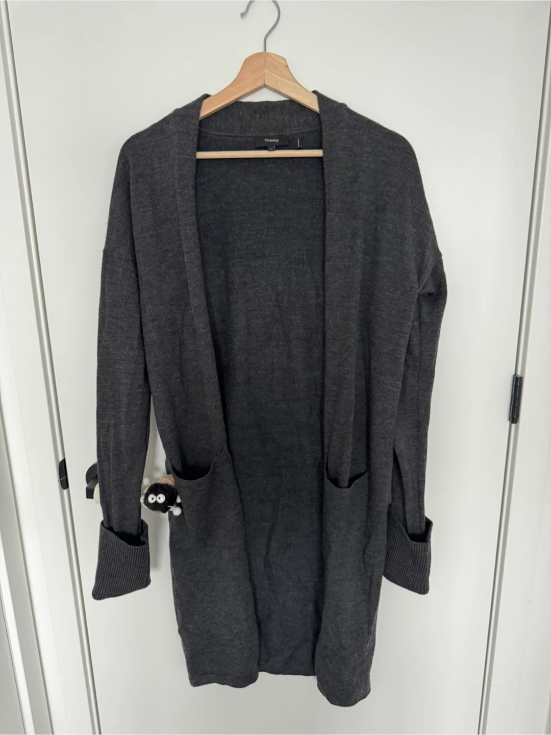 Theory knit cardigan in a dark grey colour. It's a size medium. This cardigan has front pockets and ribbed cuffs.
