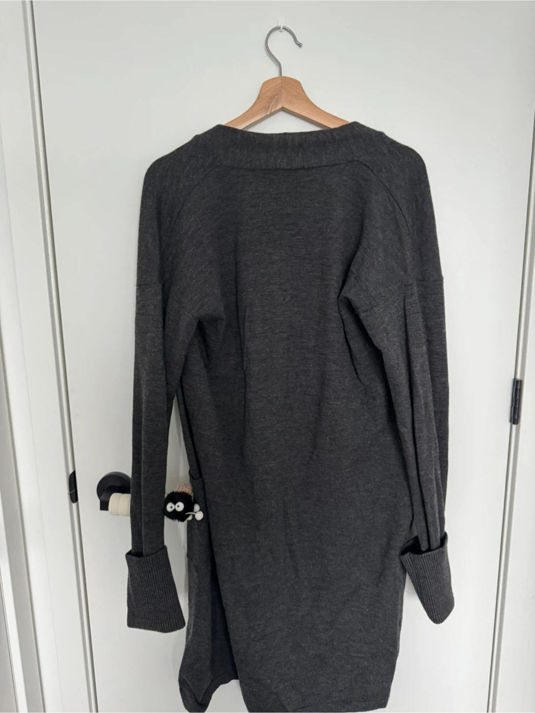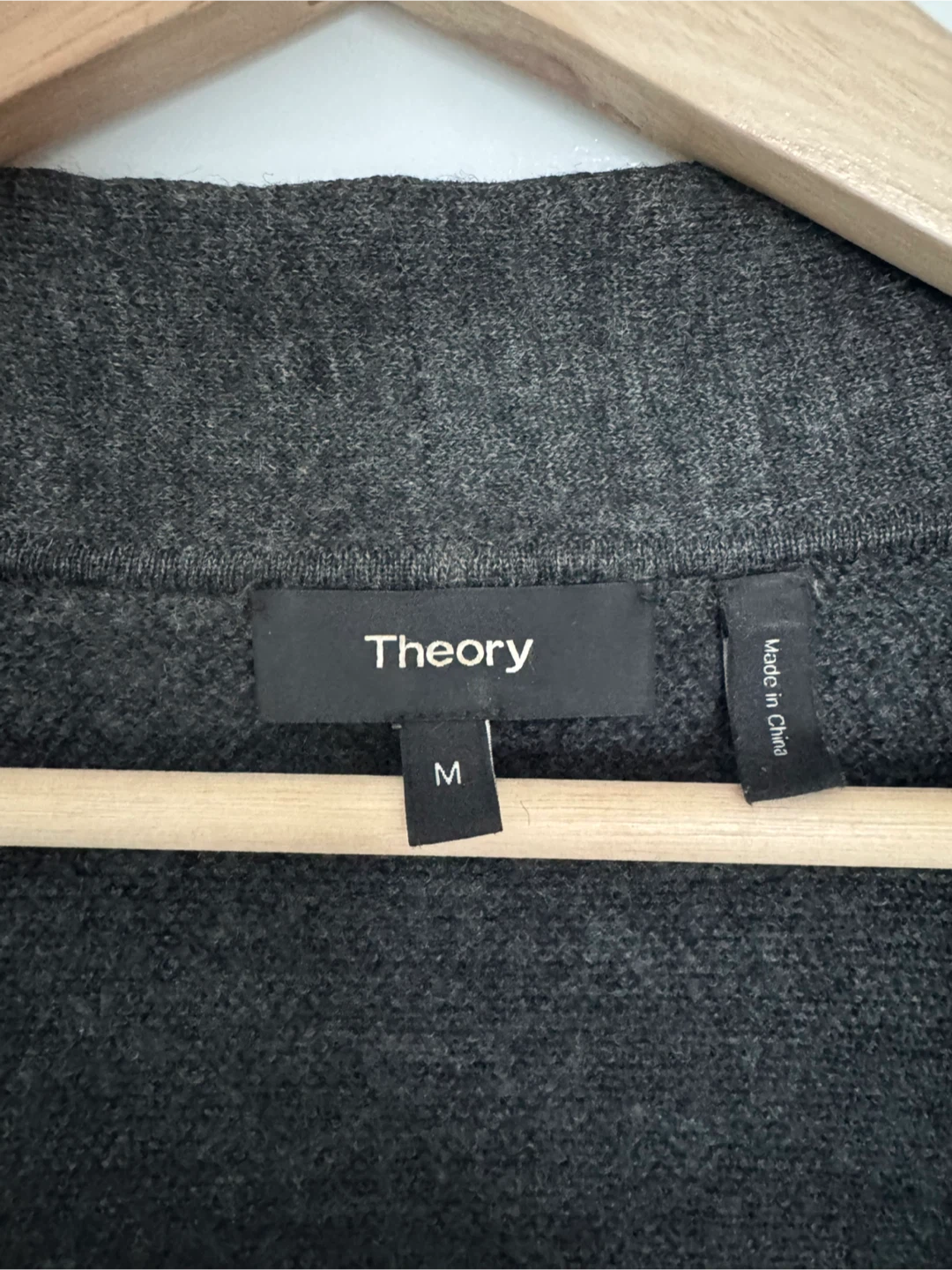 Theory knit cardigan in a dark grey colour. It's a size medium. This cardigan has front pockets and ribbed cuffs.