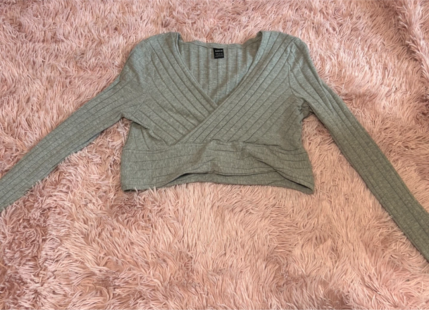 This is a grey, long-sleeved wrap top. It's made of a ribbed material. The top features a V-neckline and a cropped hem. It’s in a large but fits more like a medium!