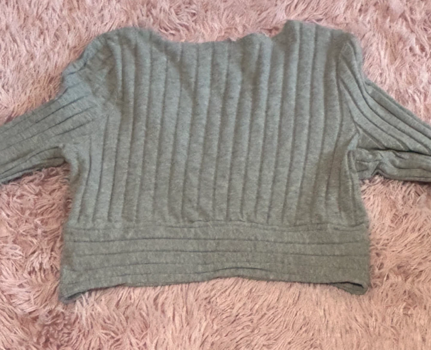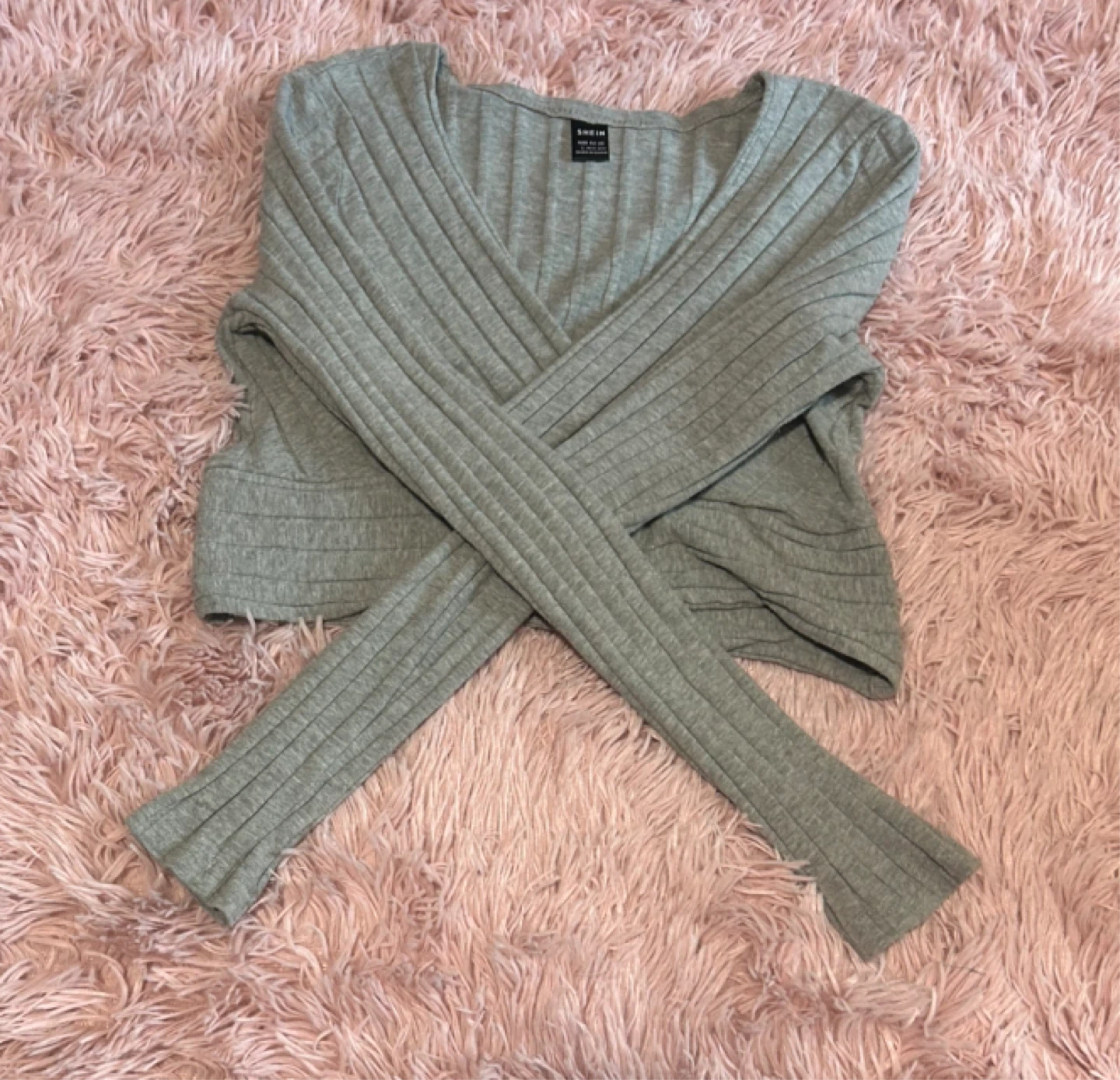 This is a grey, long-sleeved wrap top. It's made of a ribbed material. The top features a V-neckline and a cropped hem. It’s in a large but fits more like a medium!