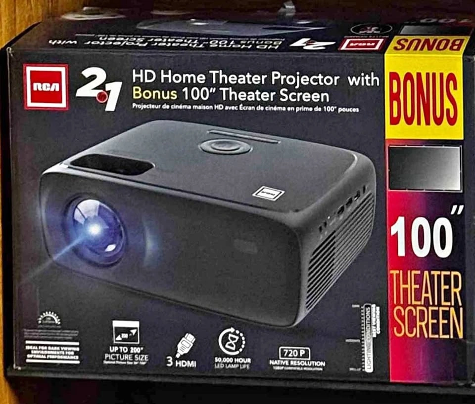 Brand new RCA HD Home Theater Projector set. Includes a 100-inch bonus theater screen. Projector supports up to a 200-inch picture size with 720P native resolution and 3 HDMI ports. LED lamp life is 50,000 hours. Ideal for dark viewing environments.
