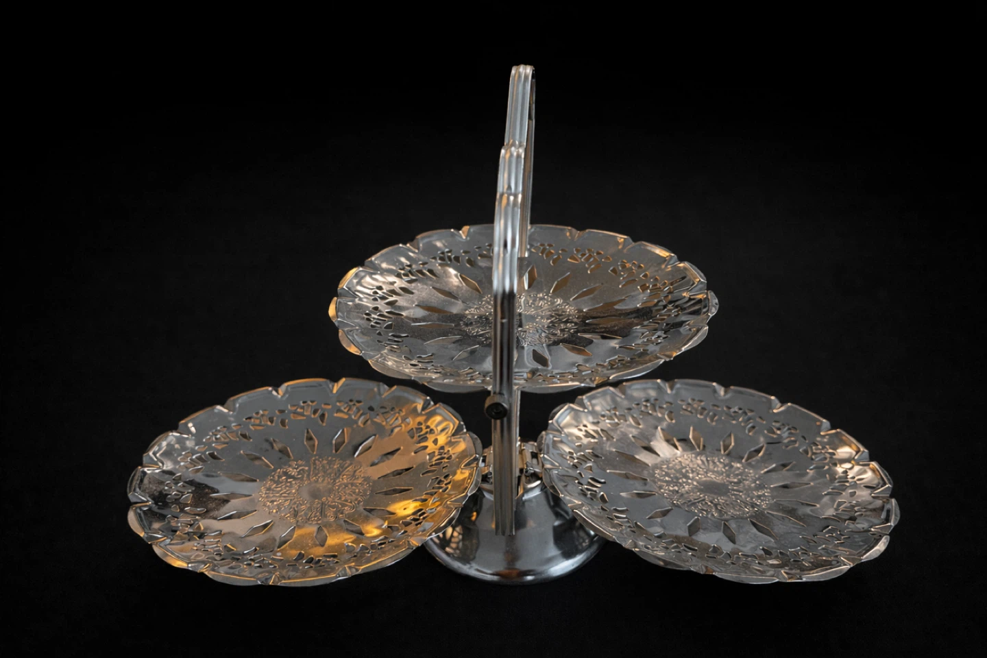 Here's a lovely silver-coloured 3-tier serving stand! It's perfect for displaying desserts or appetizers at your next gathering. The stand has a nice, decorative design on each tier.