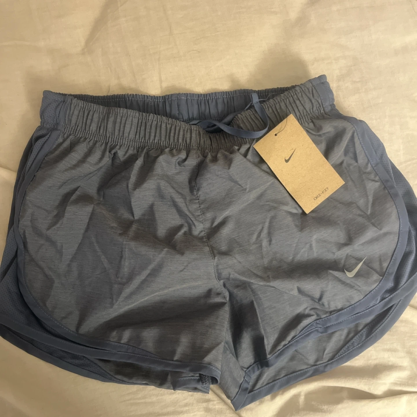 Lightweight grey Nike Dri-FIT running shorts. Features a comfortable elastic waistband with a drawstring and built-in briefs. Made in Vietnam. Perfect for your next run! NEVER WORN