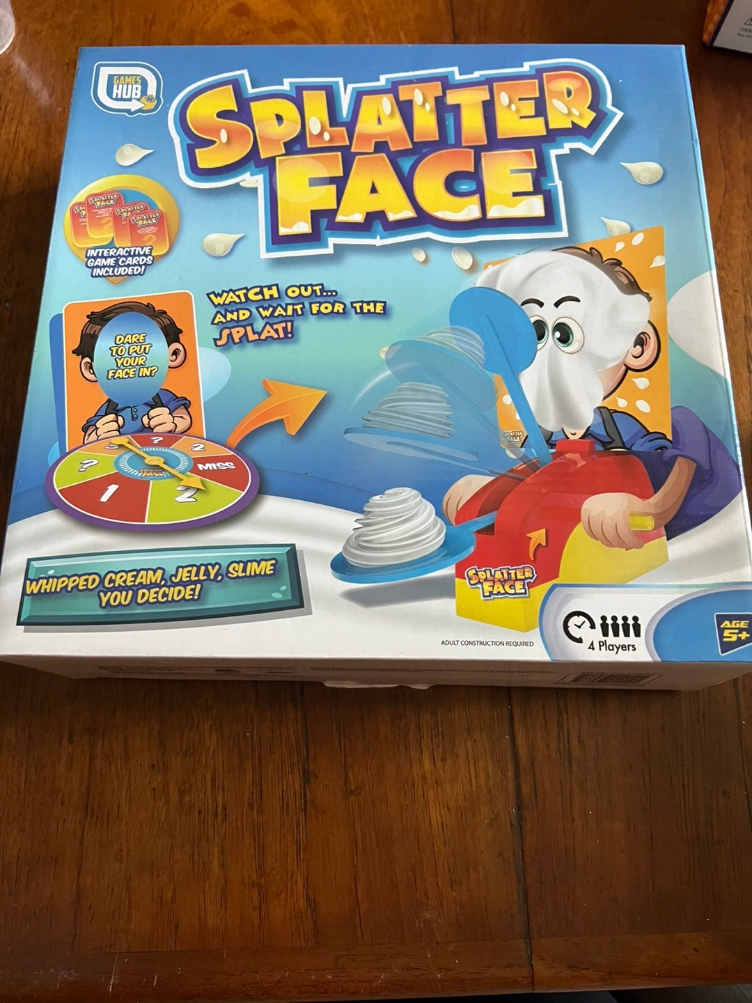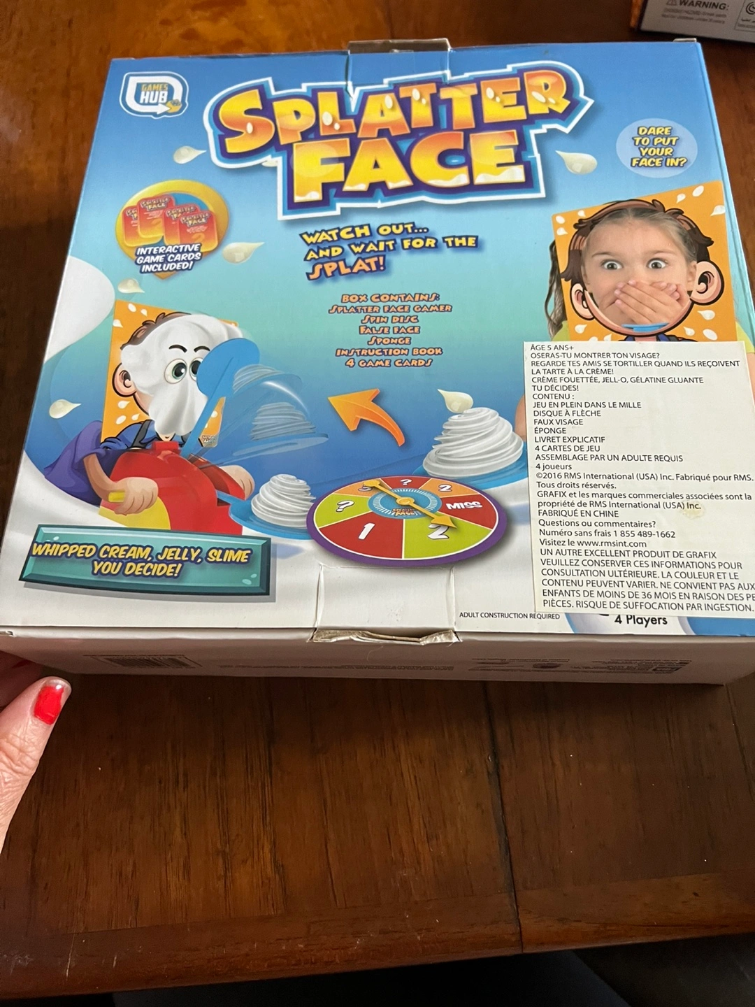 A fun game, perfect for gatherings. The box shows the game itself with a spinning wheel. Features whipped cream, jelly, or slime. Includes interactive game cards. Watch out for the splat.