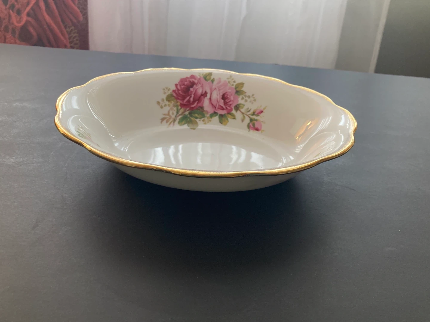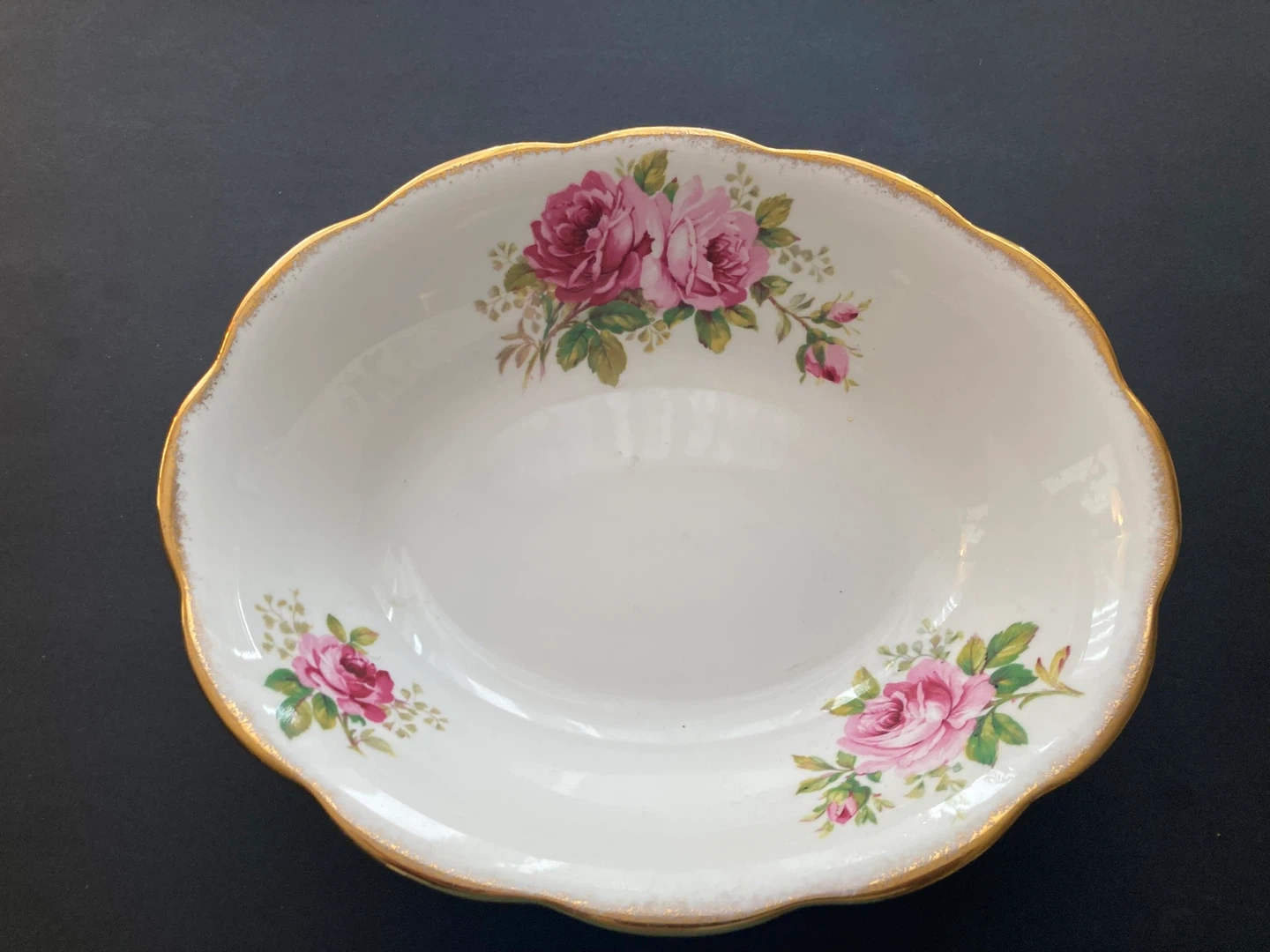 Beautiful oval serving bowl with a classic floral pattern. Features a delicate rose design and a gold trim. Made of bone china in England.