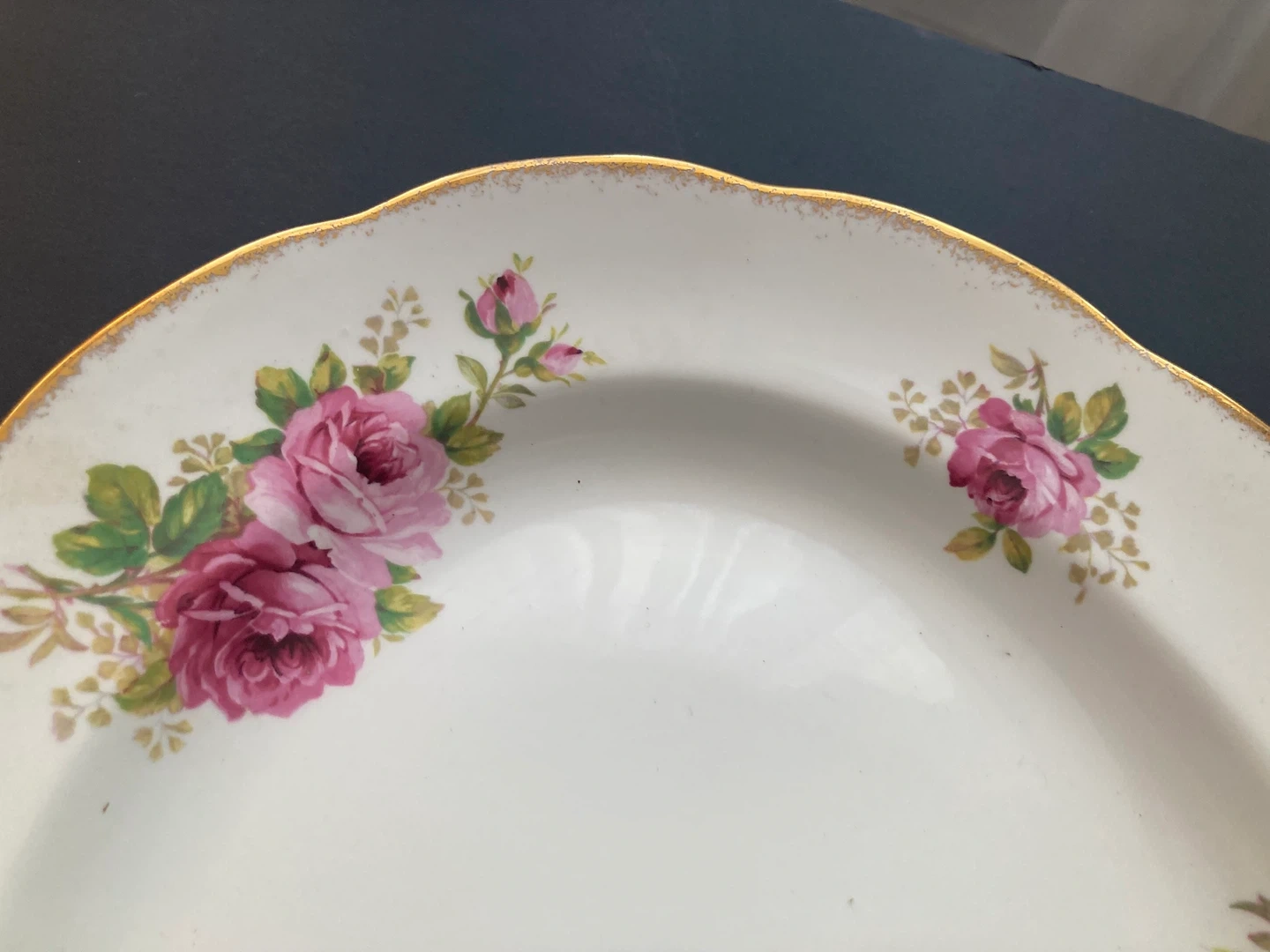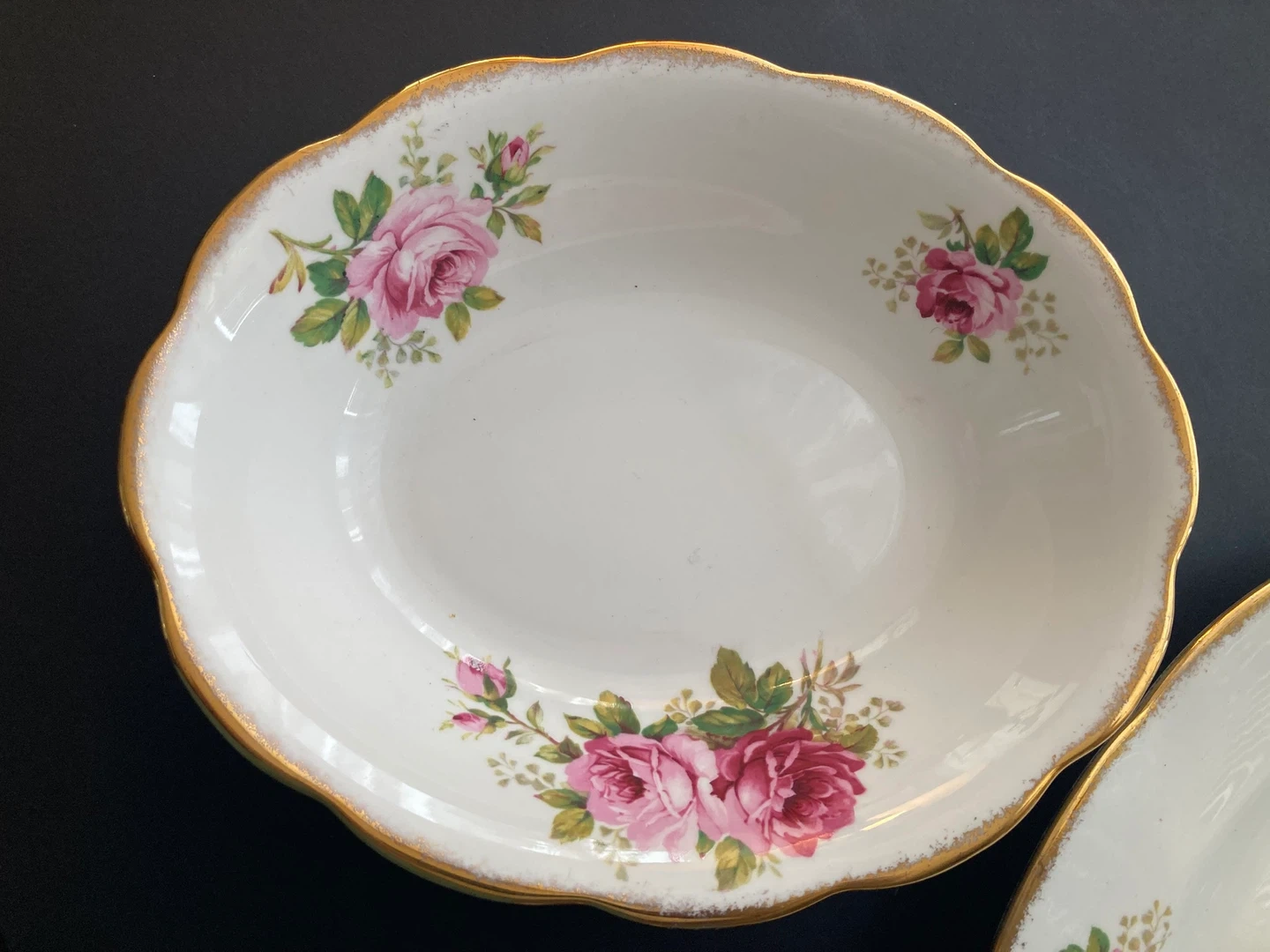 Beautiful oval serving bowl with a classic floral pattern. Features a delicate rose design and a gold trim. Made of bone china in England.
