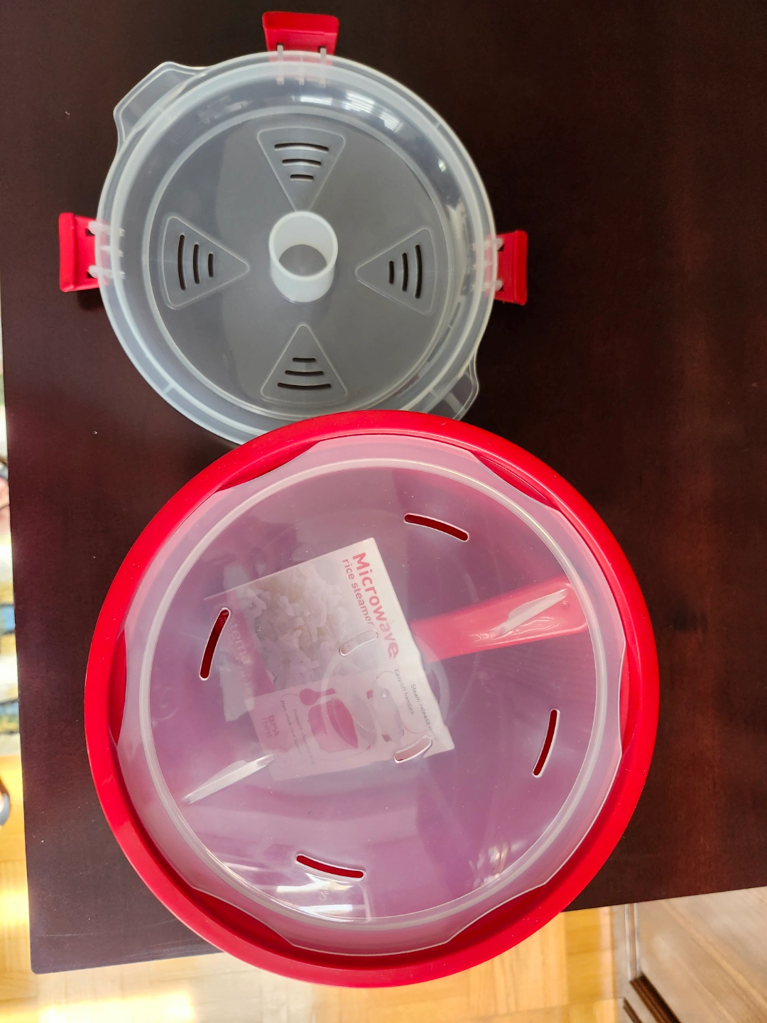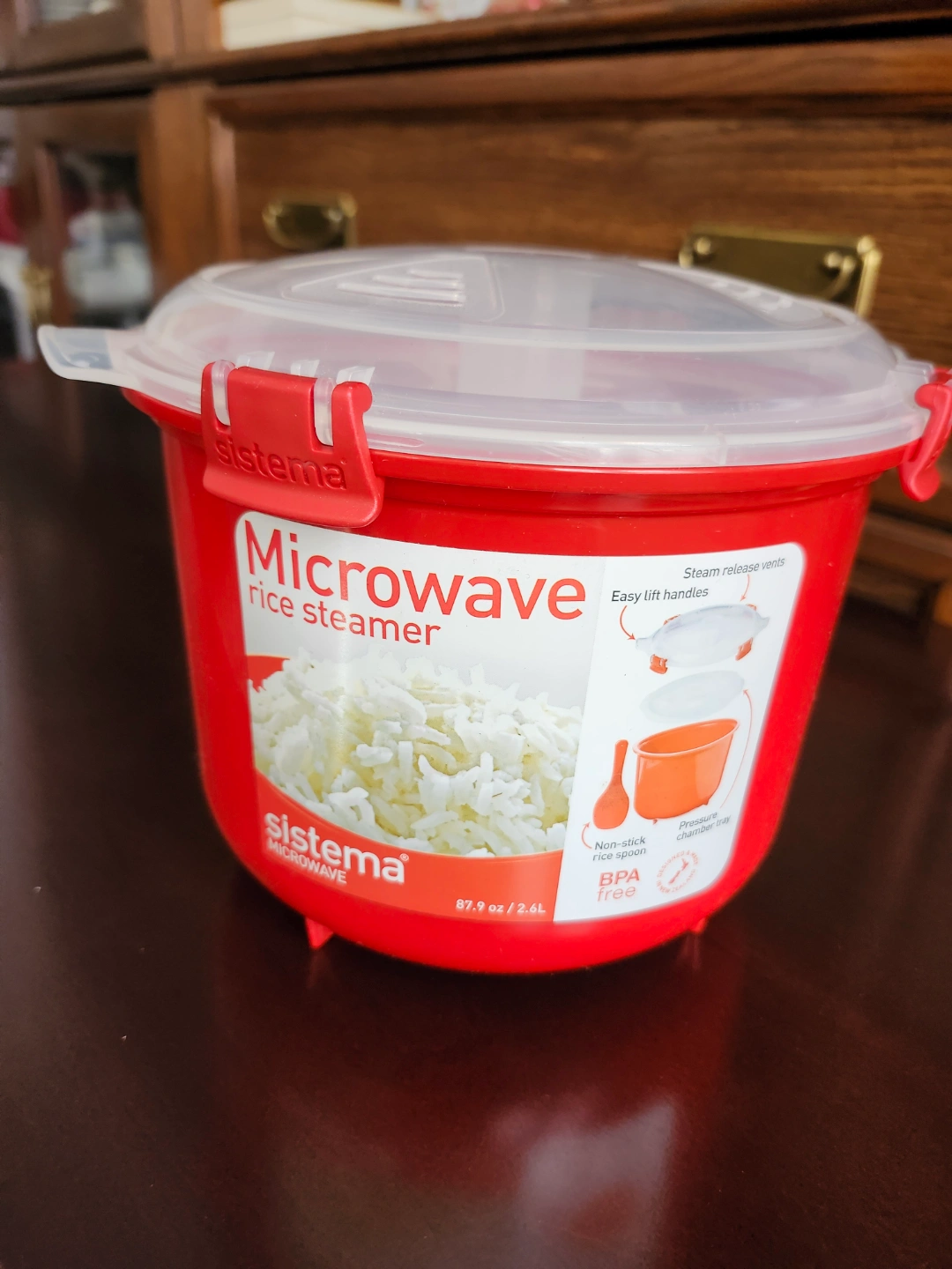 Red microwave rice steamer. Includes steamer bowl, lid, and rice paddle. BPA free. Steam release vents. Easy lift handles. Non-stick rice pan.